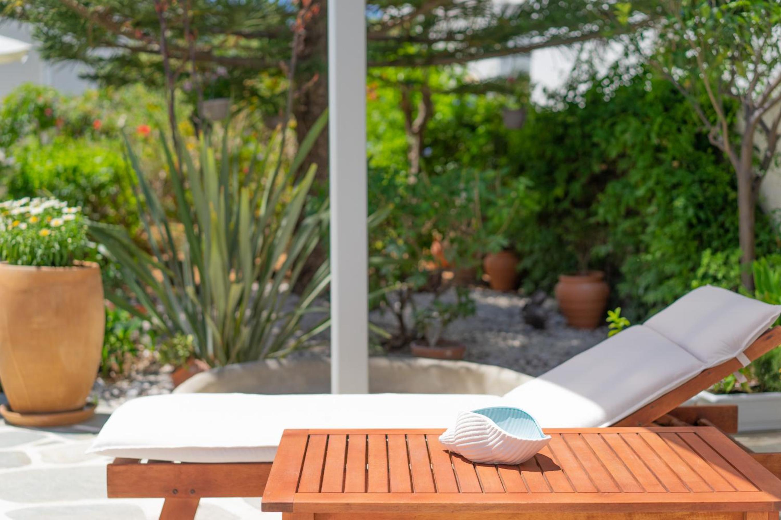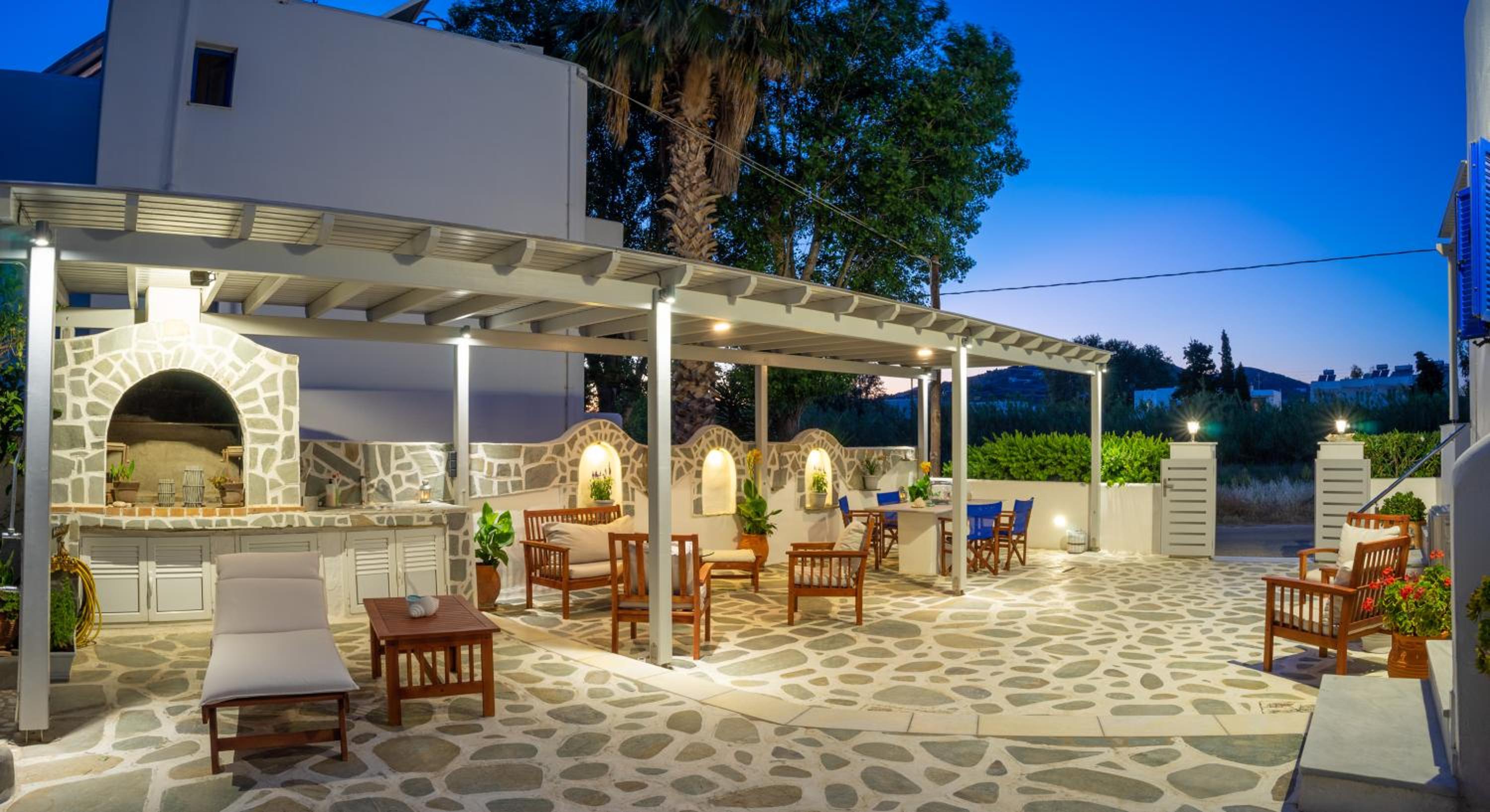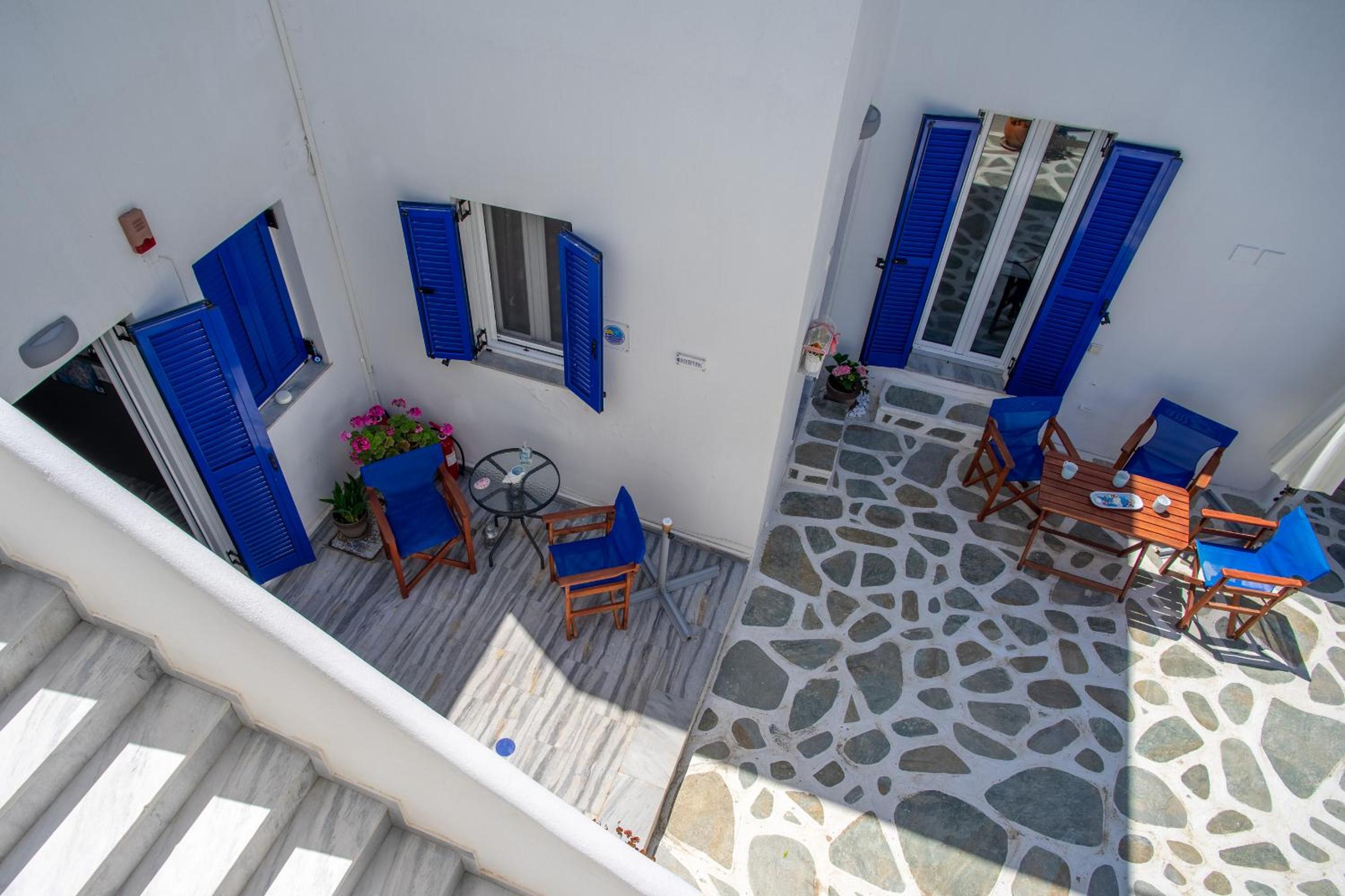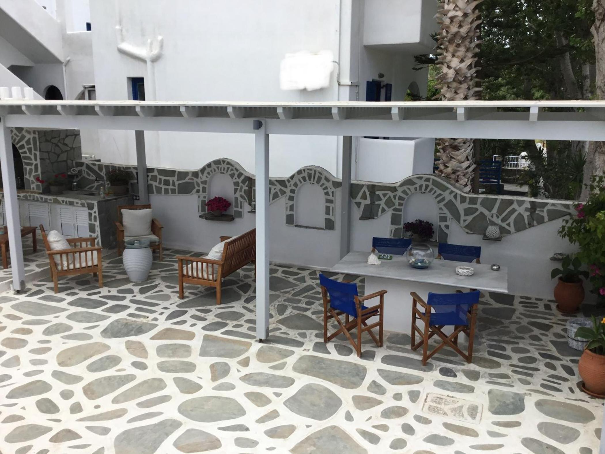 Relaxing Courtyard: The stone-paved courtyard with hammocks and BBQ facilities provides a tranquil space to unwind after a day of exploring Parikia.