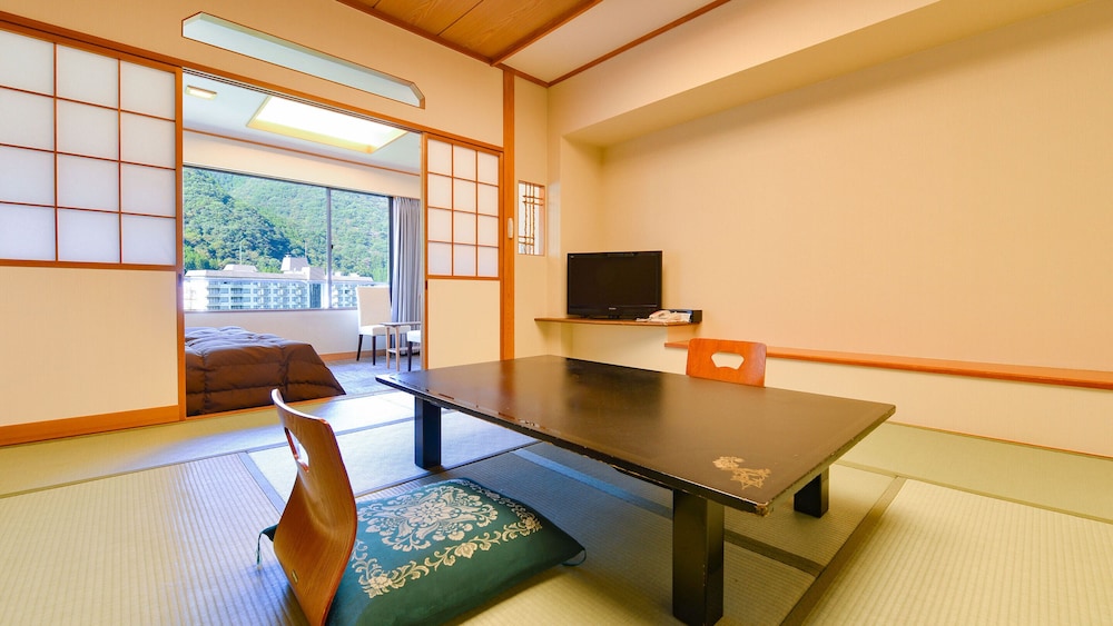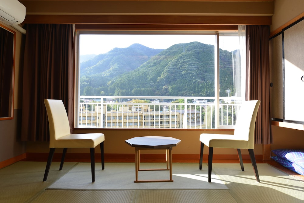 食事は、自由席のバイキング方式、量はあるが、質はイマイチ。食堂が混雑して、列ばないといけないモノがあり、冷めてしまう。温泉は室内と露天風呂が別場所。部屋からの眺めは、川が見えてよかった。全体的に雑多な印象でした。駐車場が遠いので、送迎はあるが、車に忘れ物すると、大変です。