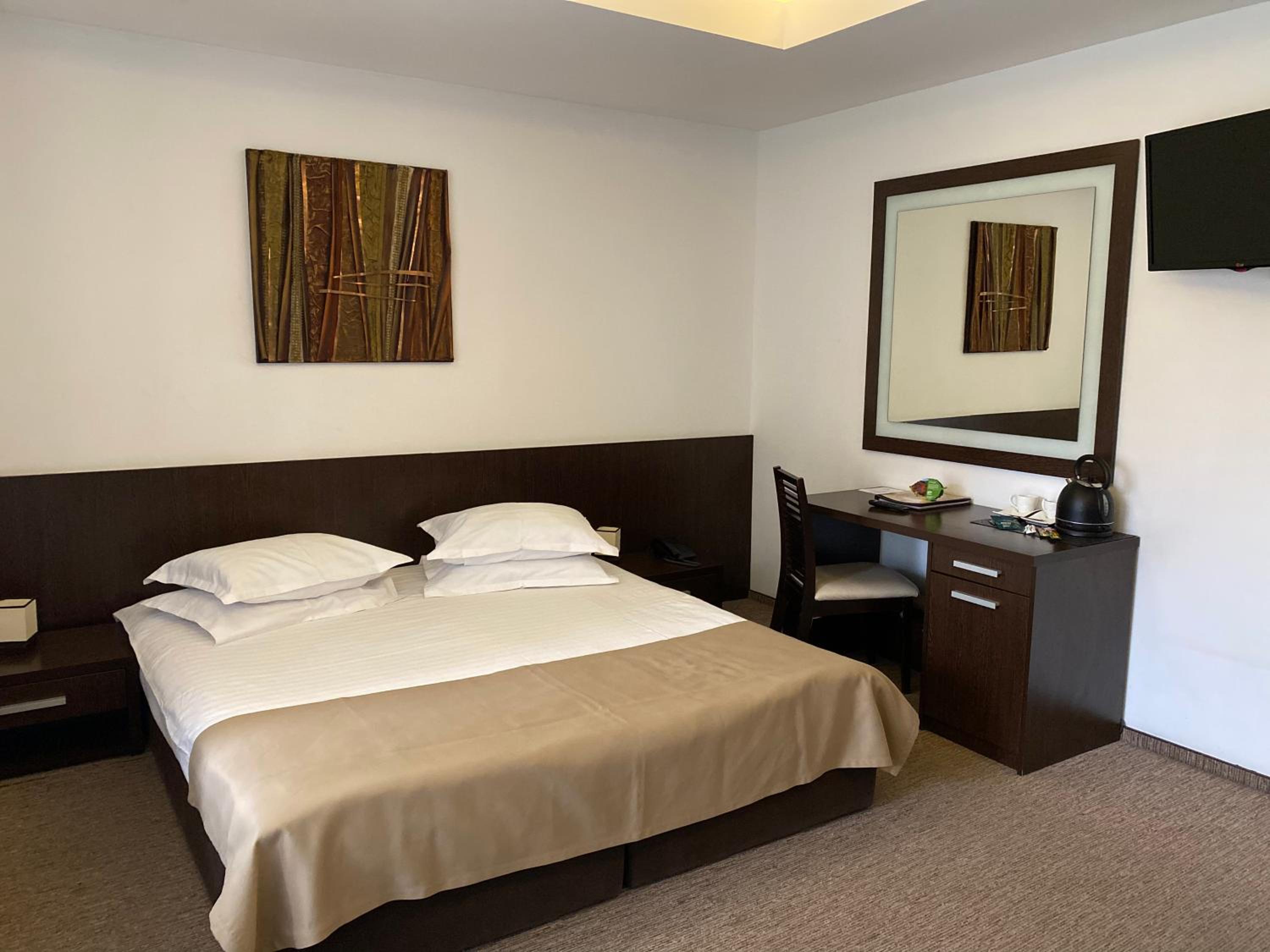 Groaznic, totul pare invechit, baia si camera sunt murdare, mocheta urata, veche si roasa. In poze arata ca ti se ofera plicuri cu cafea, sticla cu apa si cafetiera, insa acestea nu exista. Nu le folosesc neaparat, insa doresc sa atrag atentia ca turistii au scris in reviews despre aceleasi aspecte, dar si despre altele care lasa de dorit, iar raspunsul hotelului a fost ca vor remedia situatiile, insa doar spun si nu fac nimic si se pare ca nu au niciun interes pentru ca turistii sa se simta bine. Iluminat insuficient, foarte foarte slab; daca ar exista iluminat mai bun, s-ar vedea tot praful si detaliile de mizerie. Cine doreste lumina mai multa, trebuie sa vina cu lampa de acasa, dar nu prea exista prize. Rudele cu care am venit, nu au primit camera pe care au achitat-o, ci una mai mica. Check-in si check-out online foarte defectuos, nu au receptie si la numarul de telefon din holul hotelului nu raspunde nimeni. Daca veti intampina probleme, nu vi se rezolva. Turistii asteapta cate o ora in hotel ca sa primeasca link-ul pentru completarea formularului de check-in, cu toate ca acest link ar trebui sa fie functional imediat dupa rezervare. Comunicare deficitara. La numarul de telefon din rezervare raspunde o persoana de la o agentie, care nu rezolva nimic si nu revine cu raspuns. La hotel nu se poate servi mic dejun si pana in centrul statiunii este mult de mers. Nu exista aer conditionat. Sunt ursi prin zona. O parte a curtii este lasata in paragina, deci o priveliste deplorabila. Ar trebui inlocuite saltelele, mobilierul vechi si inchis la culoare, care intuneca si mai mult camera, mocheta rupta, robinetii mizerabili si zgariati din baie, chitul sau siliconul umflat si dezlipit. Hotelul arata de 2-3 stele, nu de 4 stele si prea scump pentru ce ofera. Am gasit masina blocata de alta masina, pentru ca nu sunt decat sase locuri de parcare. Bateriile de la clanta usii camerei erau descarcate si aproape ca nu mai puteam intra in camera si nu ai cu cine rezolva problema