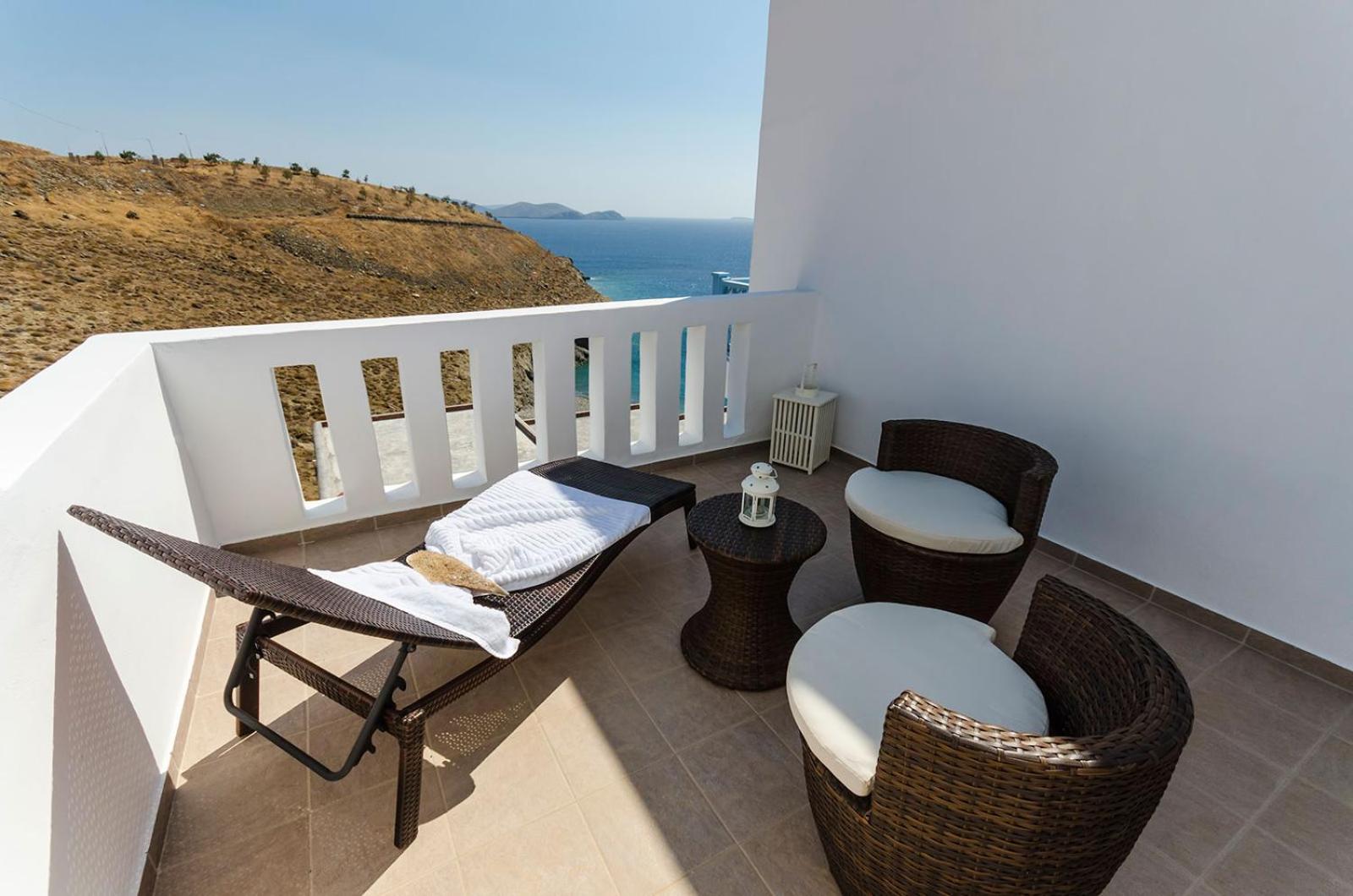 Experience breathtaking views of the Aegean Sea from your own balcony at Votsalo. The hotel is conveniently located just 200 meters from the beautiful beach of Pera Gialos, offering a perfect seaside getaway.