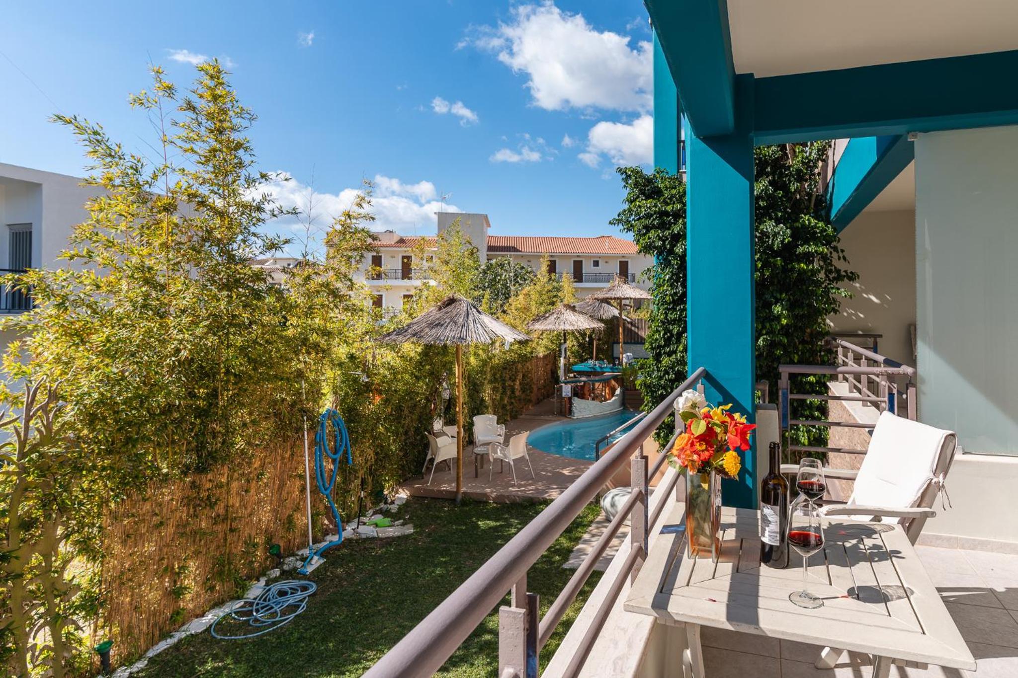 Relaxation and Leisure: Unwind in the pool, hot tub, and lush flower garden just steps away from the sandy Finikounta Beach. The garden bar offers refreshing drinks, while massages can be arranged for ultimate relaxation.