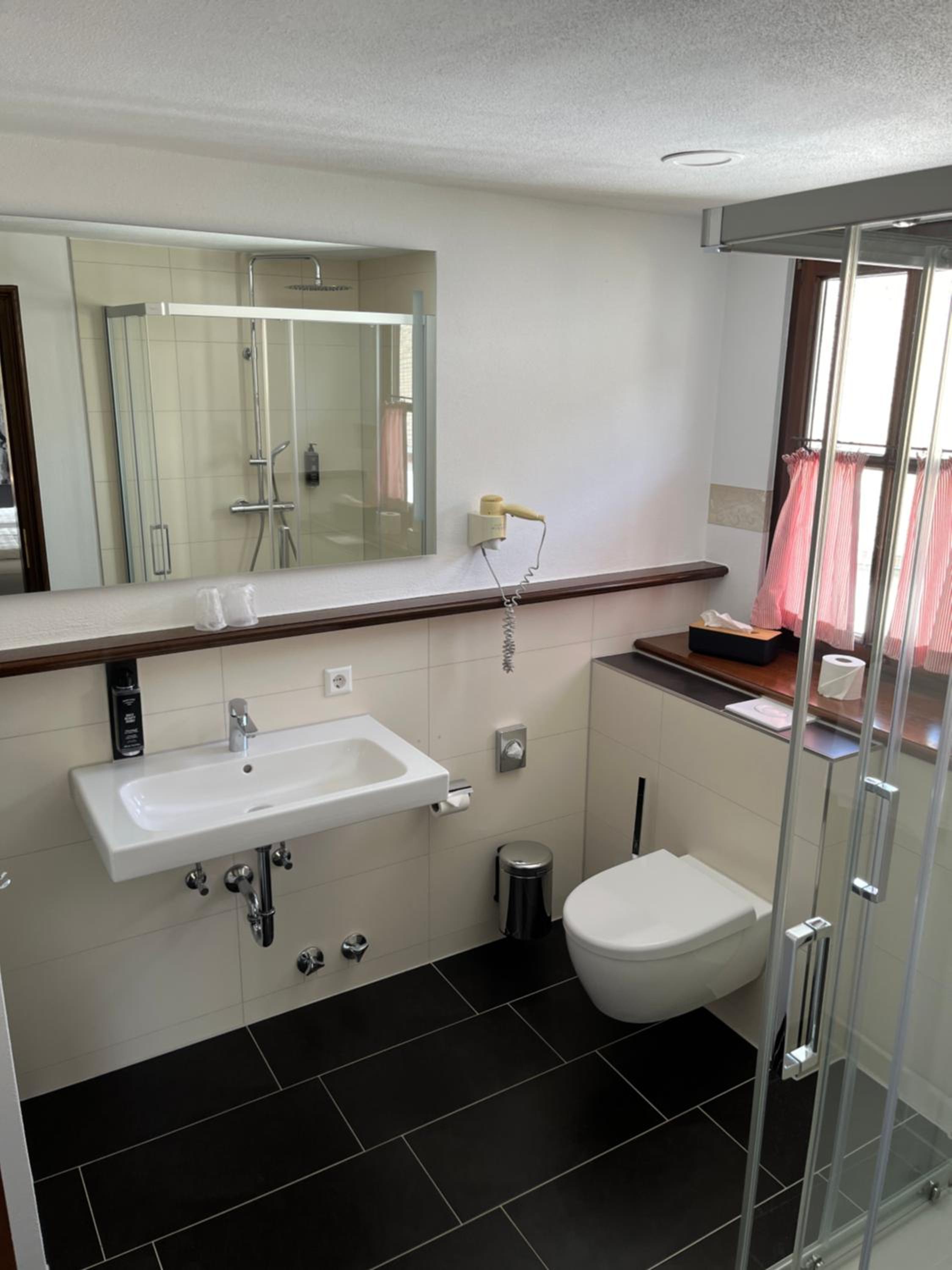 Sehr altes, unmodernes Badezimmer, Badezimmer zu klein, Schimmel in den Zimmern an der Decke, an den Holzfenstern, mein Mann ist Allergiker und hat deshalb 2 Nächte kein Auge zu gemacht...Es wird mit einem Indoorpool geworben - der ist leider mit unter 25 Grad unterirdisch kalt, schwimmen besonders mit kleinem Kind was ja eher planscht, als sich bewegt VIEL zu kalt. Abendessen/warmes Essen haben wir nicht in Anspruch genommen, da mit frühestens 18 Uhr auch viel zu spät für uns. In dem Ort gibt es noch nicht mal eine Bäckerei oder Supermarkt, geschweige denn ein Imbiss oder Restaurant, man ist gezwungen nach Winterberg zu fahren um zu Essen. ACHTUNG: Hotel liegt direkt neben einer Kirche und die klingelt mit dem Glocken seit 7 Uhr morgens bis nach 20 Uhr abends, wie man es eben kennt um Viertel nach, Halb, Viertel Vor, Volle Stunde. An erholsamen Schlaf mit gekipptem Fenster war daher nicht zu denken.