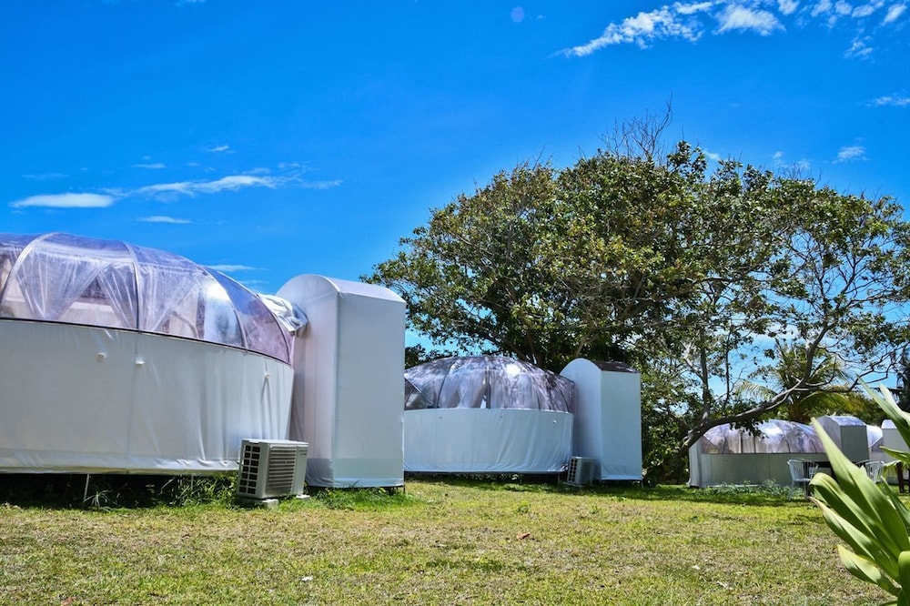 Hotel distinto con 4 bungalows estilo igloos y 4 en tubo, todos con baño y ducha propios e invividuales. Personal super amable y buena ubicacion. Aunque no es dificil localizarlo, no es demasiado visible la 1a vez. Bastante cuidado con aire de naturaleza salvaje. En toda la zona no hay buenas playas, pero es buena opcion si visitas Chetumal. Se encuentra saliendo hacia Calderitas, 300 m despues de la rotonda de la universidad, a mano derecha. Pueden ofrecerte cena simple en el mismo bungalow. Buena opción. Puedes ver el cielo desde la cómoda cama del igloo ya que a petición te retiran la funda opaca superior quedando con otra transparente. Distinto, curioso y económico.