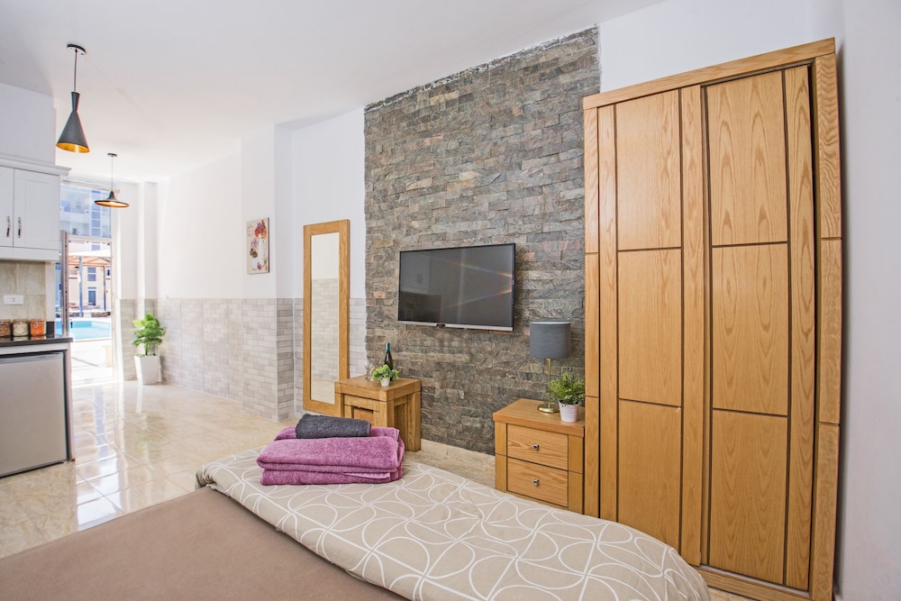 Mukava ilmapiiri ja todella hyvät uima-altaat. Taxilla pääsee nopeasti kaupunkiin. Sänky mukava ja huone siisti keittiö huoneessa plussaa.