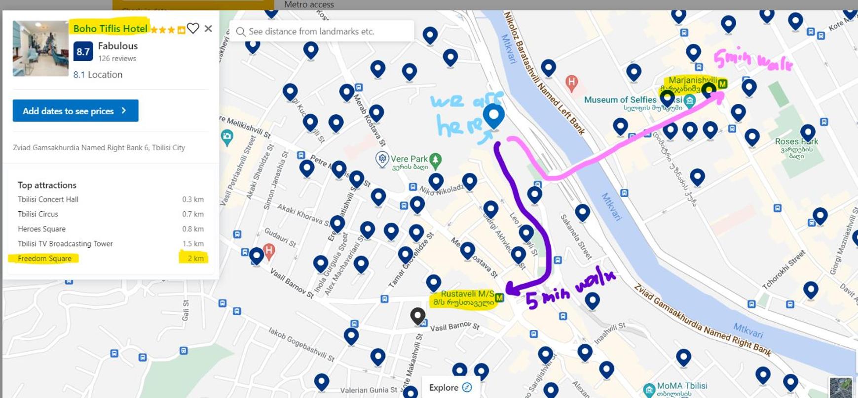 BOHO Tiflis Hotel is a comfortable hotel with a generally good location, although it was a little complicated to find at first. After about a 5-minute walk from the hotel, you can reach the Tbilisi Concert Hall bus station, which makes transportation around the city convenient.