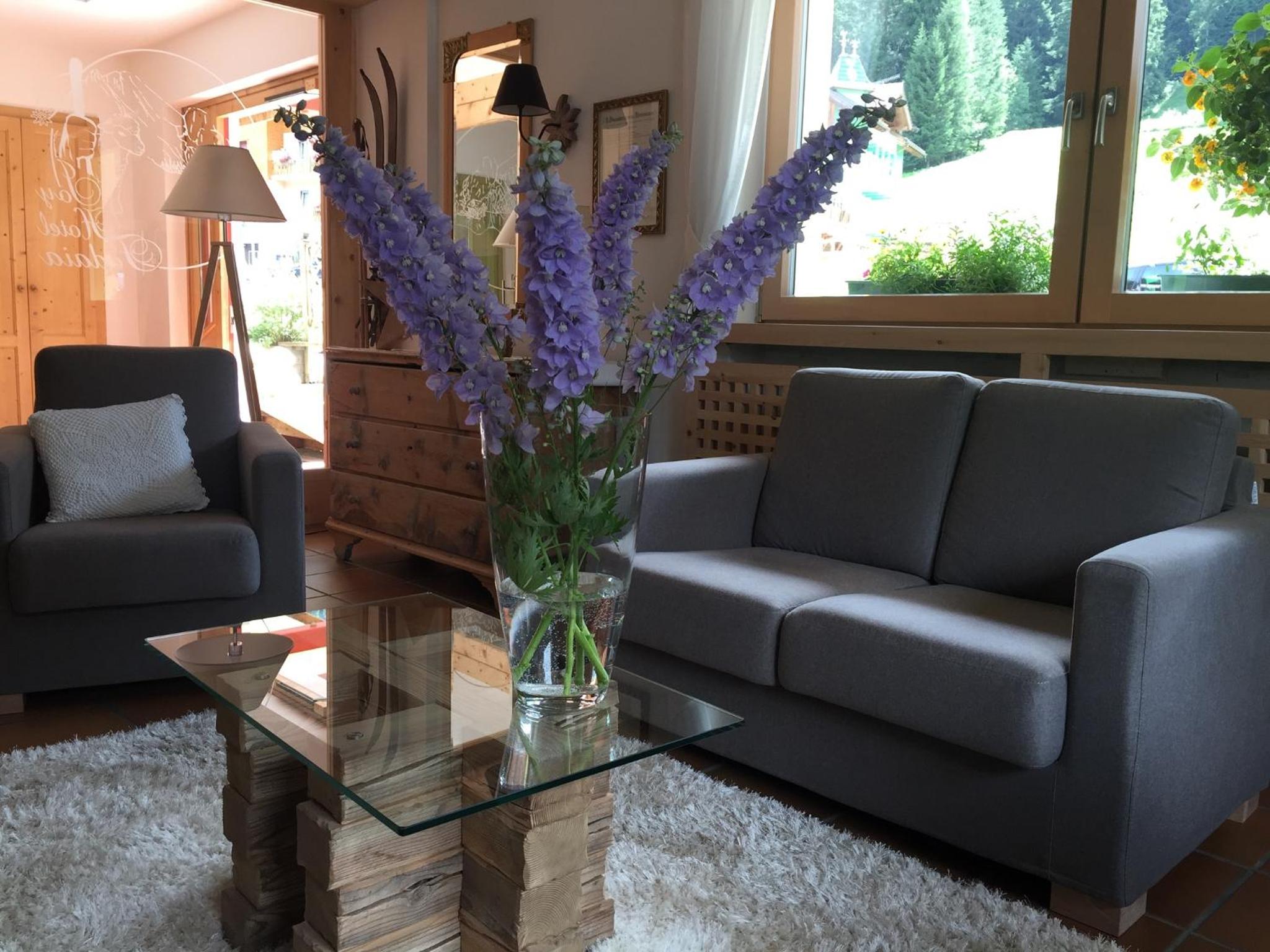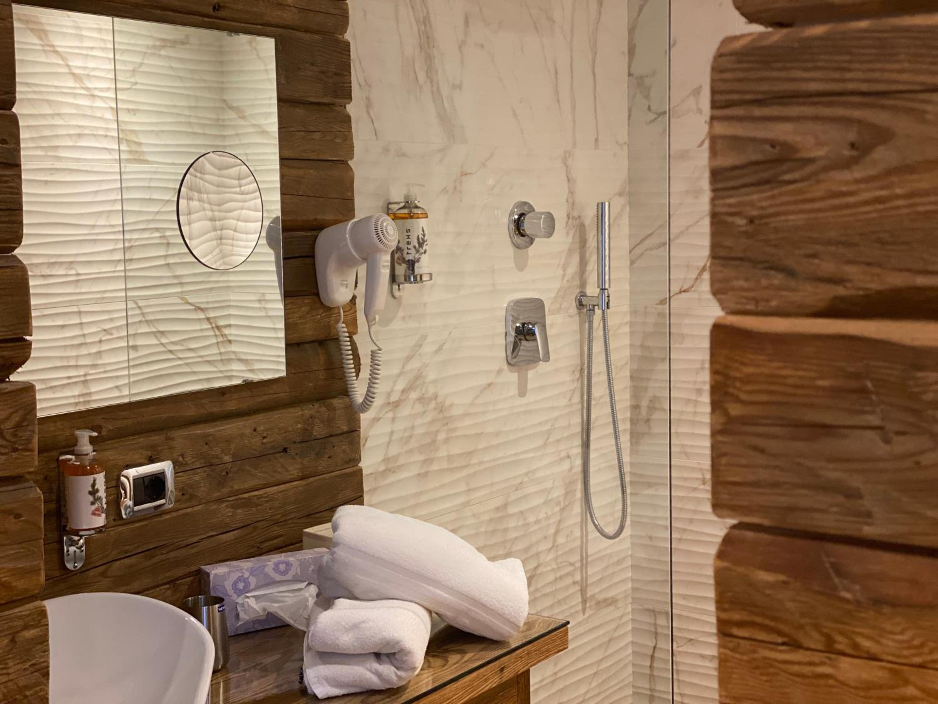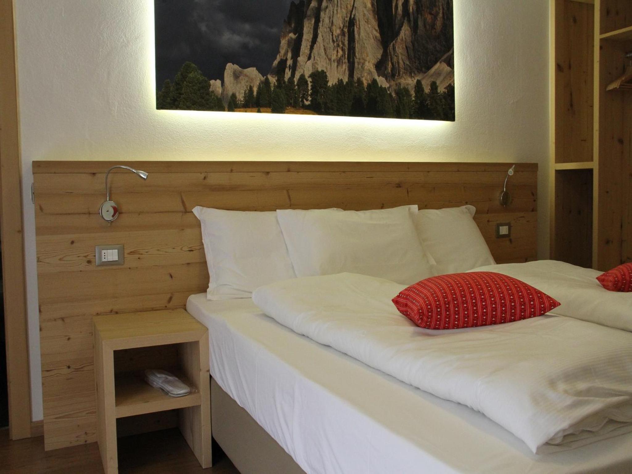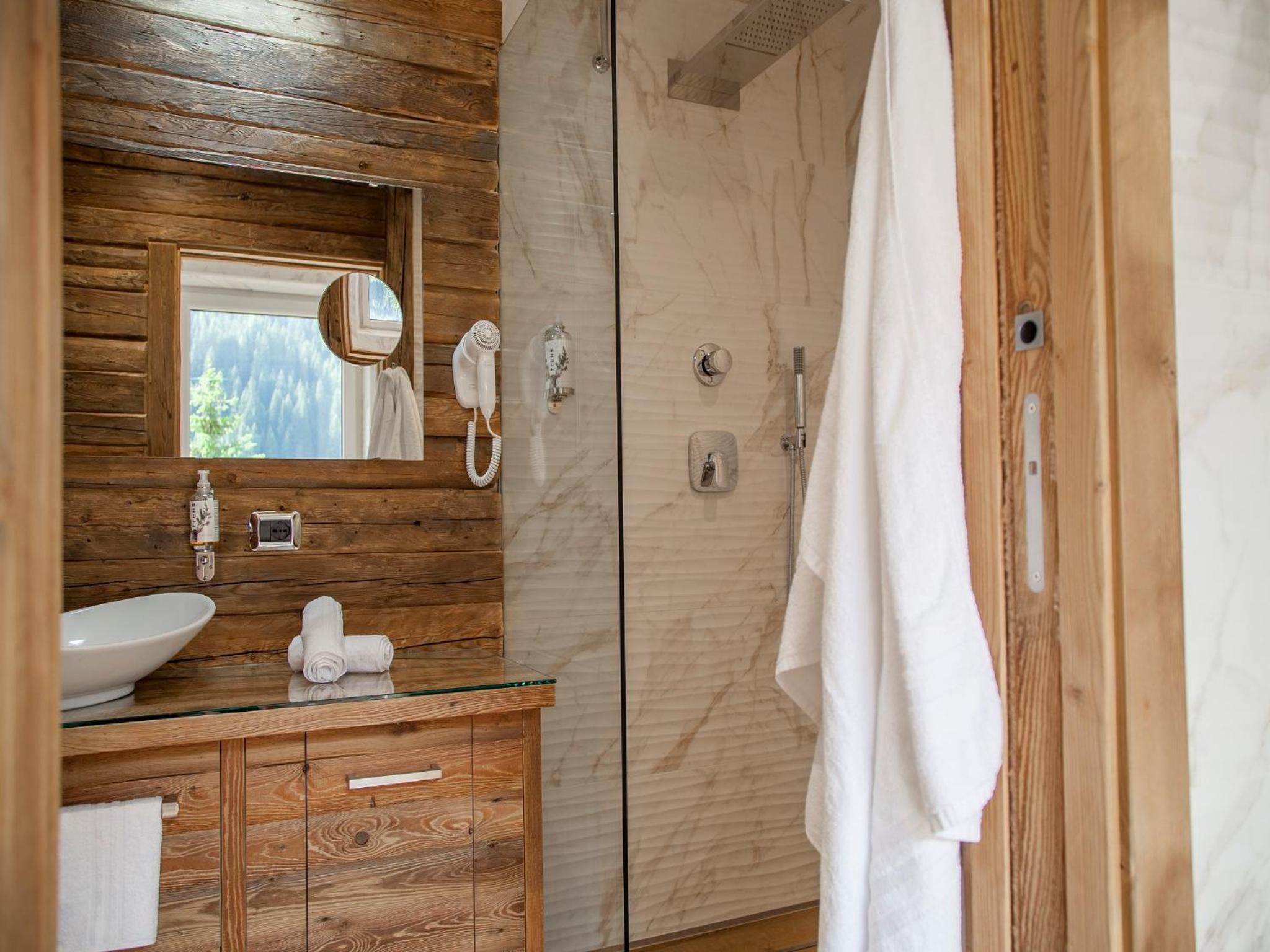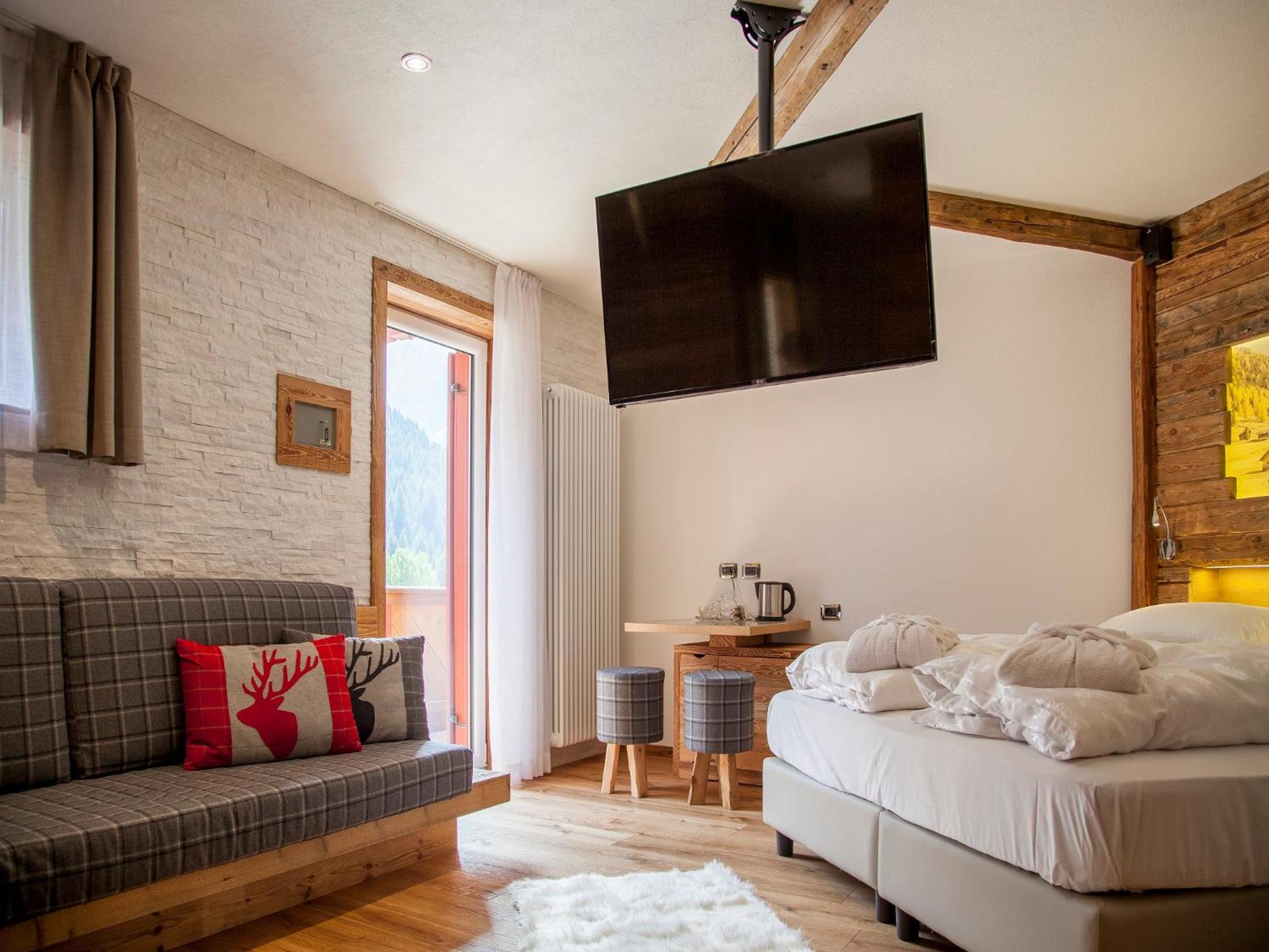 Cozy Comforts: Experience the warmth of wooden furniture and the stunning views of the Dolomites from your private balcony. Unwind in front of the flat-screen TV with satellite channels or pamper yourself in the modern bathroom with complimentary toiletries and a hairdryer.