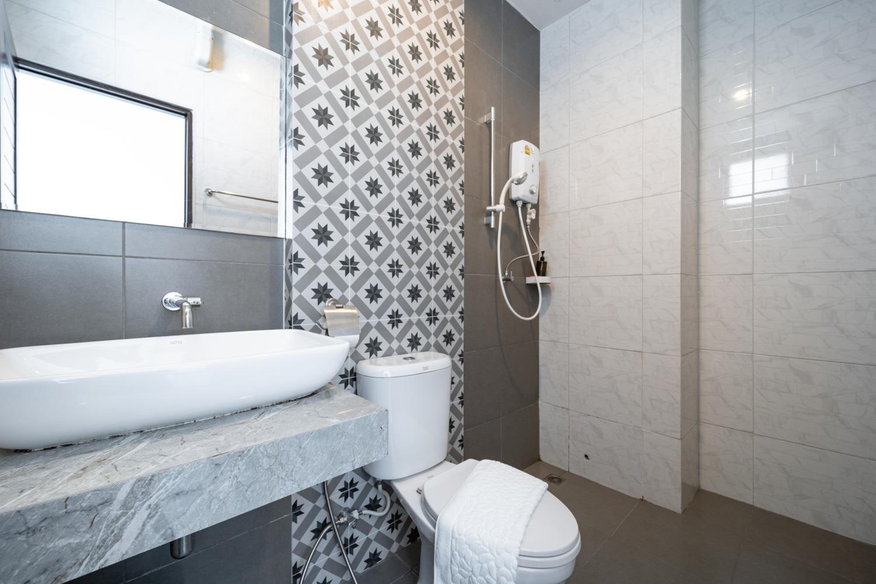 This is a nice hotel,with lovely helpful staff. The room was clean, comfortable and the bathroom was the usual Thai open shower, which we're used to now... be careful as they can be slippery! We also had a very useful fridge.