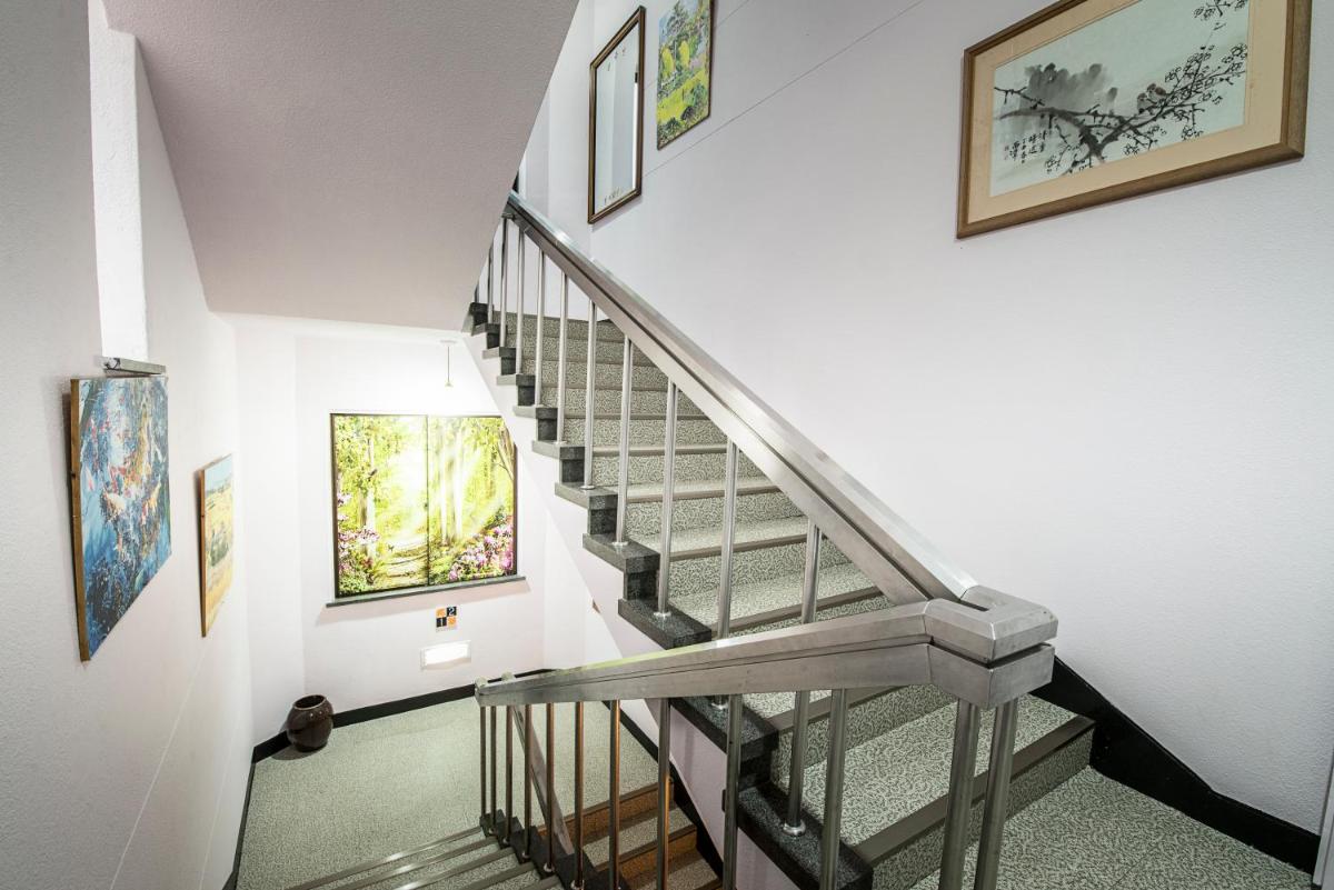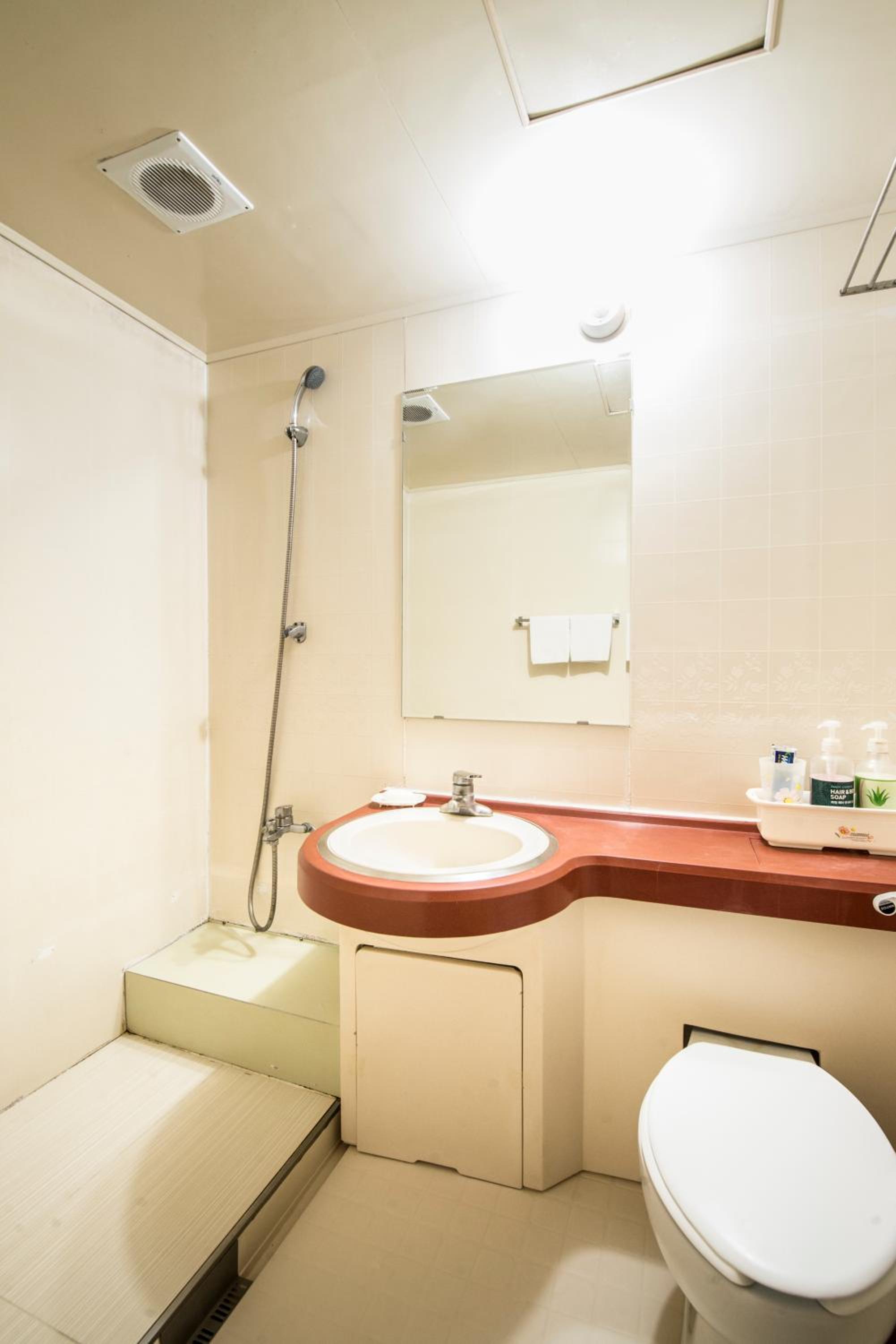 Типичный ушатаный номер с кривой дверью в туалет , потому что она с алюминия и сломанным замком . Когда моешь руки открываешь кран вода бежит на пол, и стекает в отверстие в полу для душа. И стульчак на унитазе просто исшоркан надо было сфотографировать его. Зато кондиционер работал. Для тайцев с вьетнамцами из деревень бамбуковых хижин это просто супер люкс. Там через одно здание выше по улице другая гостиница есть , даже фойе в ней намного богаче выглядит почти за те же деньги и номера лучше . Пожалел что остановился в этой. Беда Южной Кореи во многих отелях не говорят на ресепшене на английском даже в курортных местах.