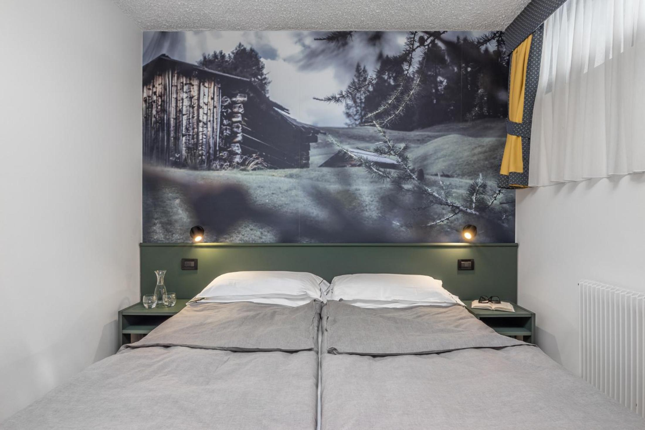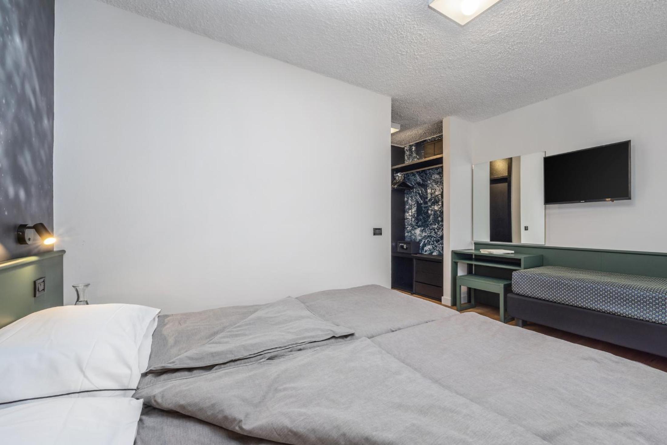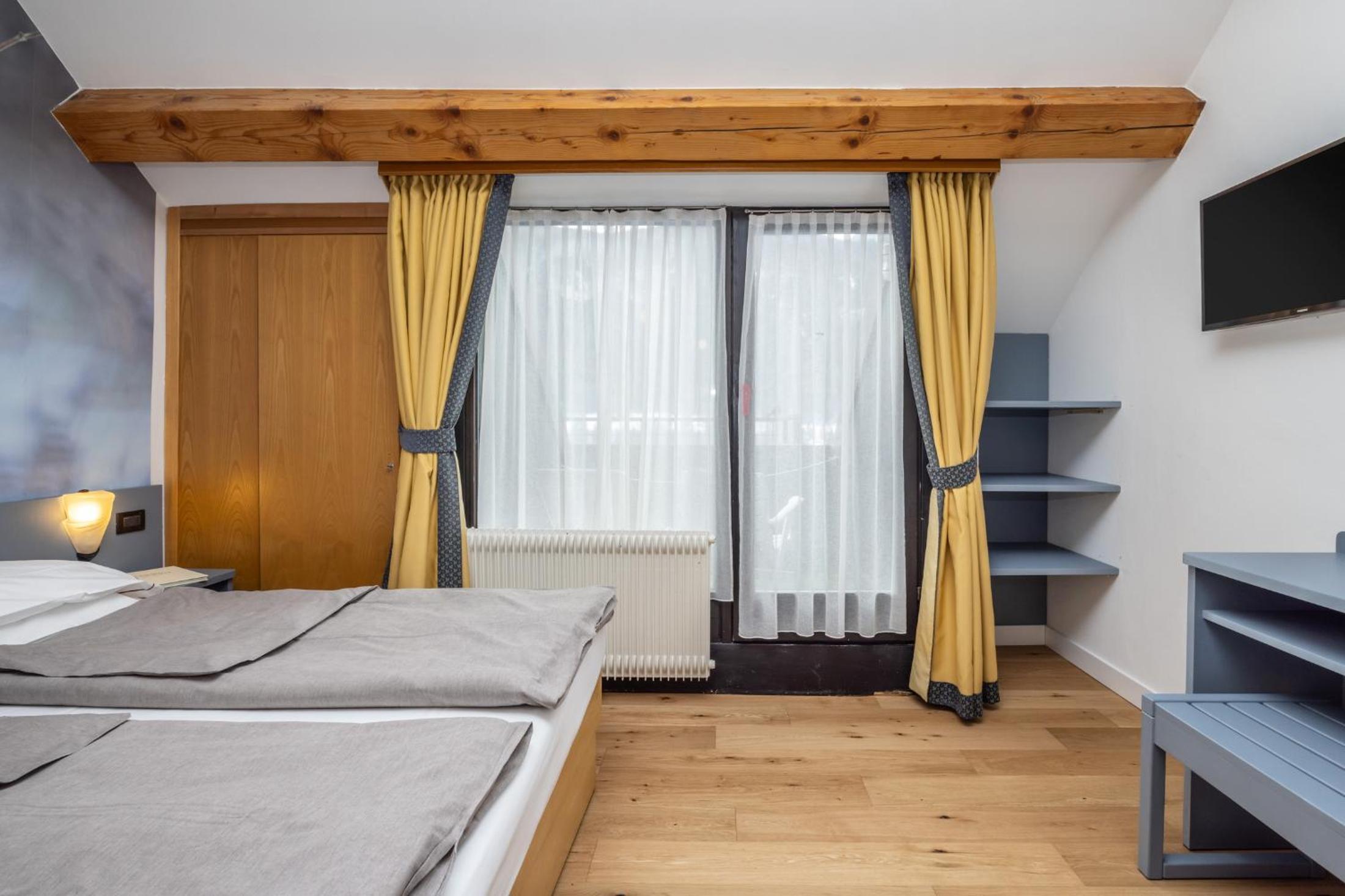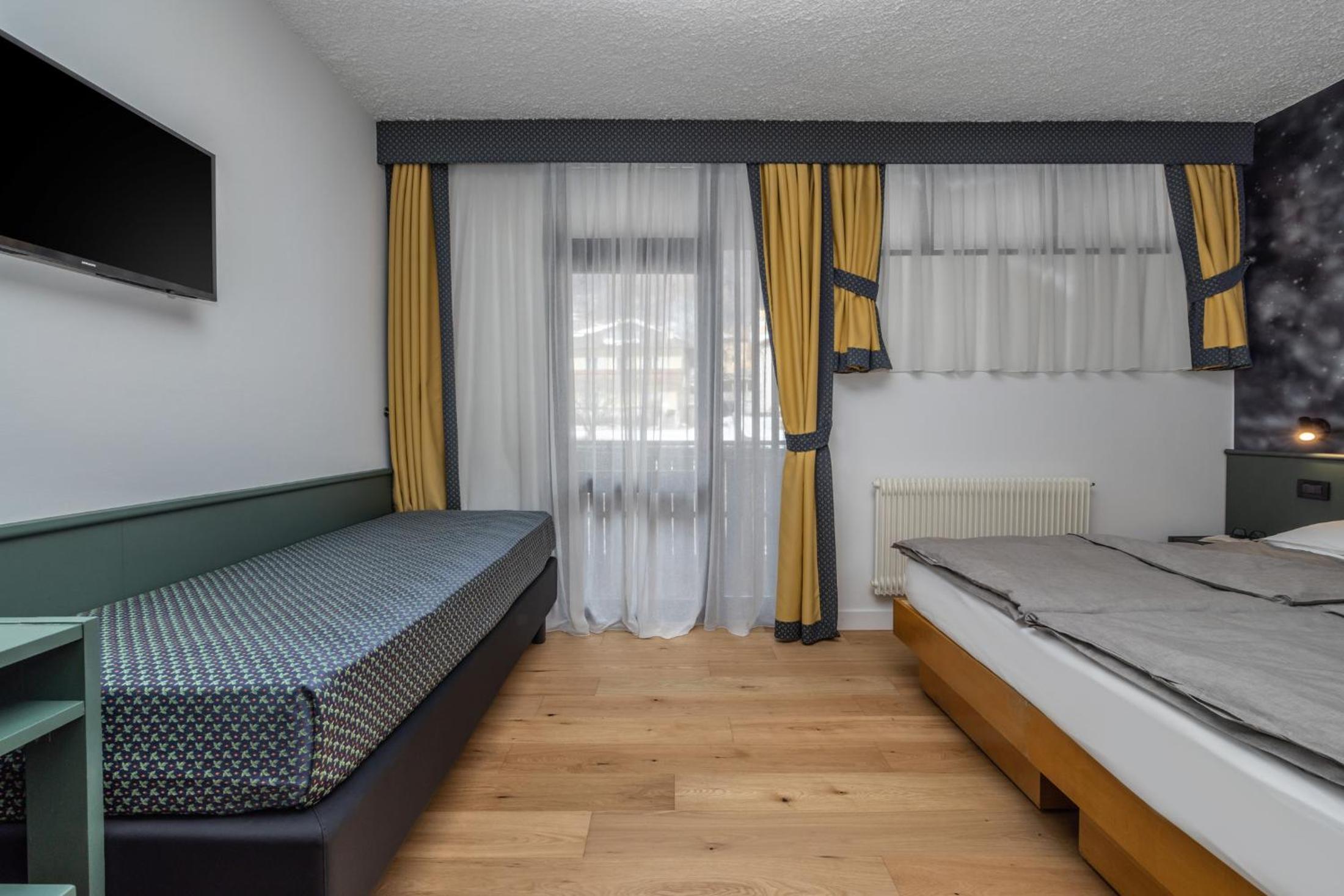 Basic rooms with dated and minimal furniture. Not ski-in ski-out, need to drive 10 minutes or take the hotel shuttle. Limited breakfast with not hot food items - traditional Italian.