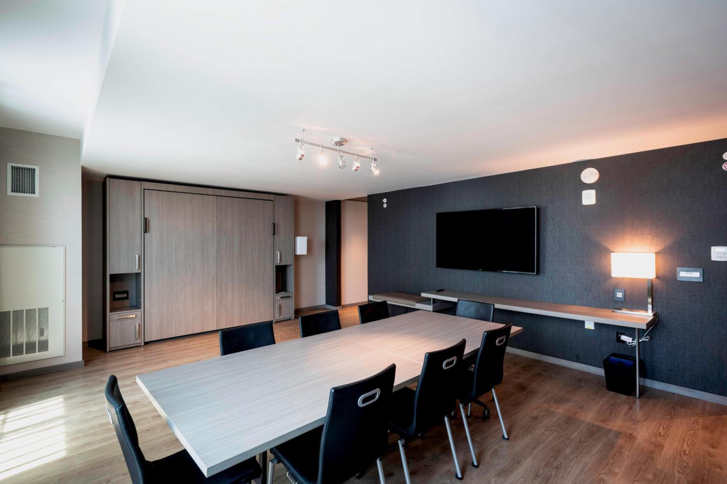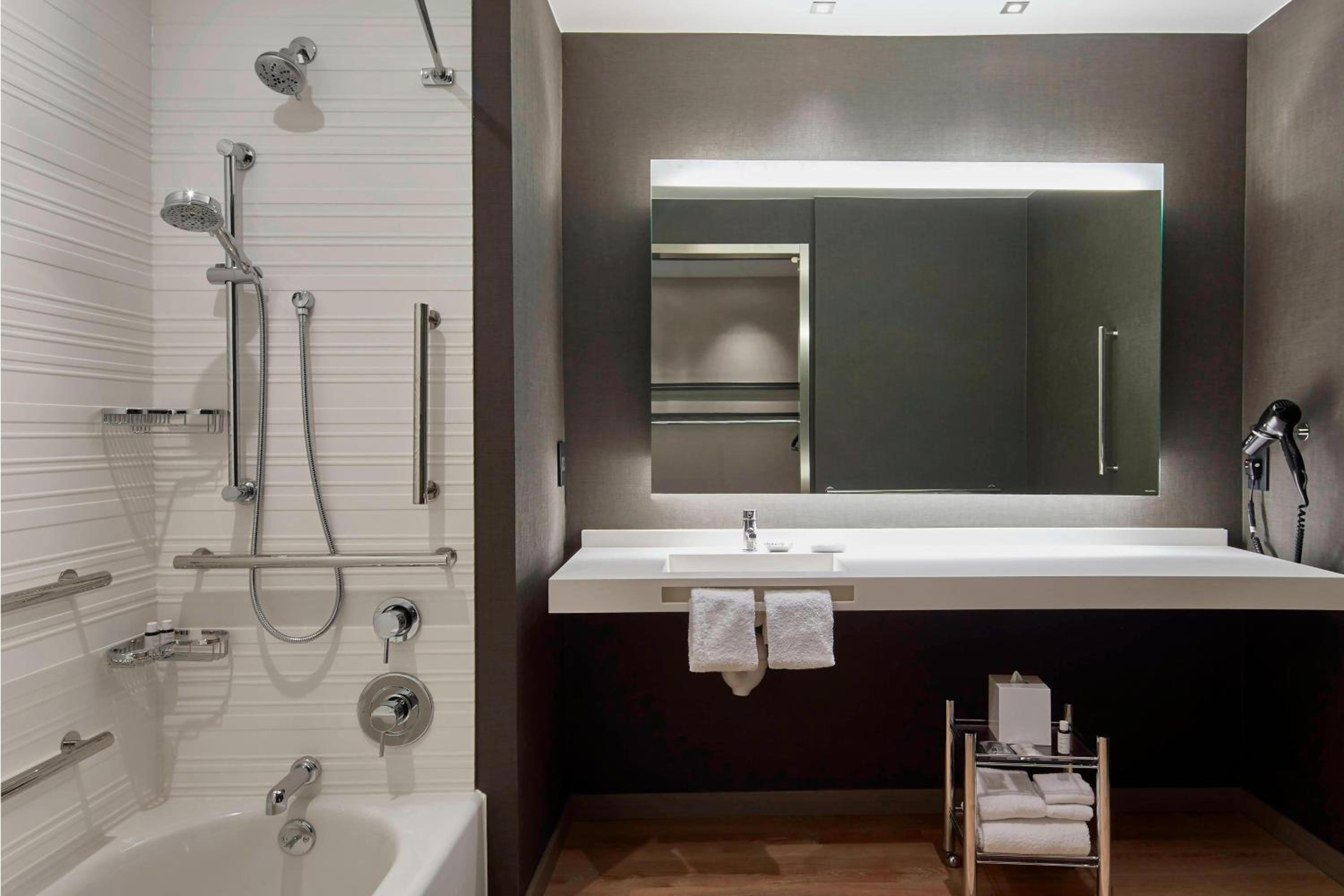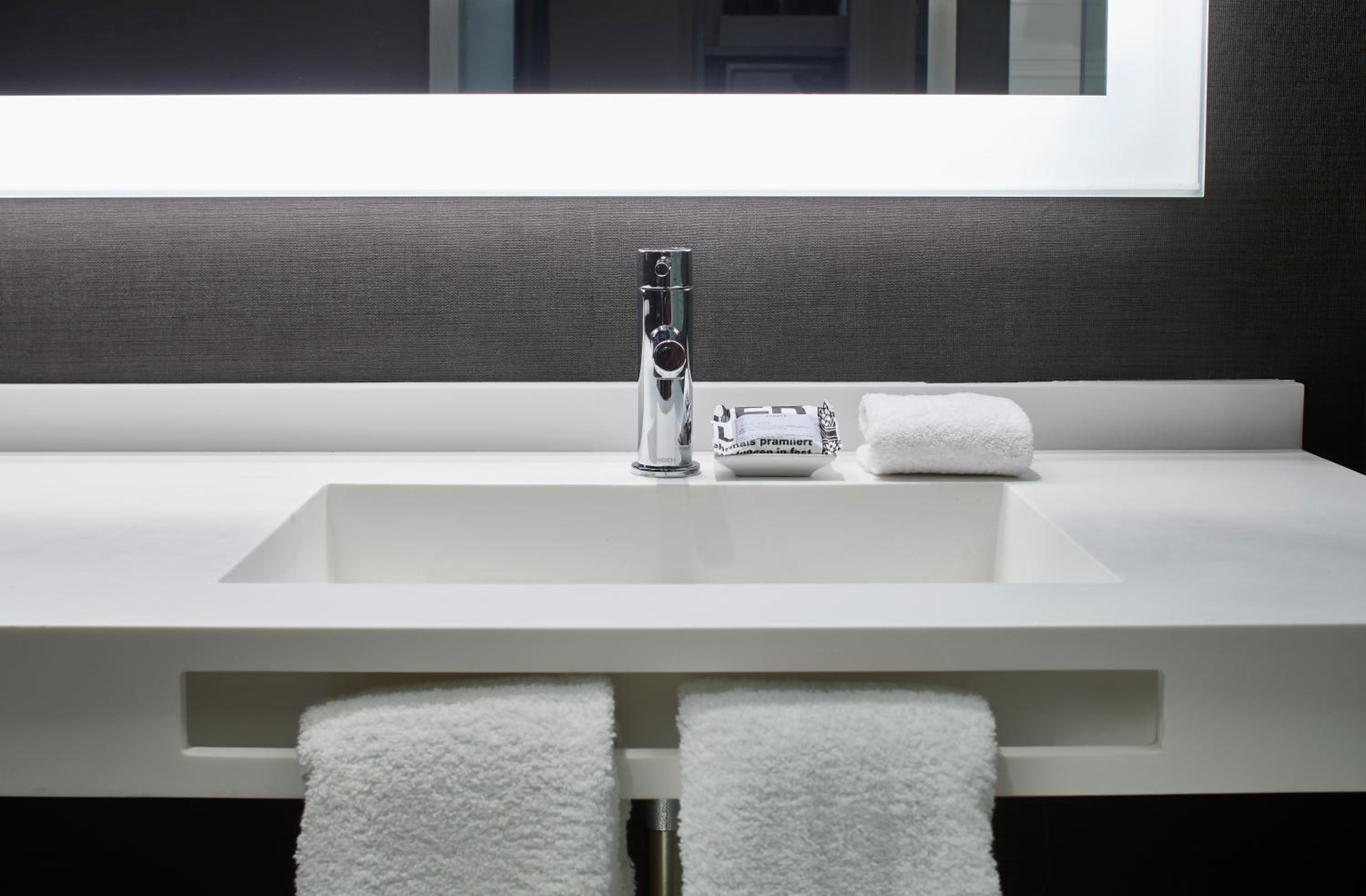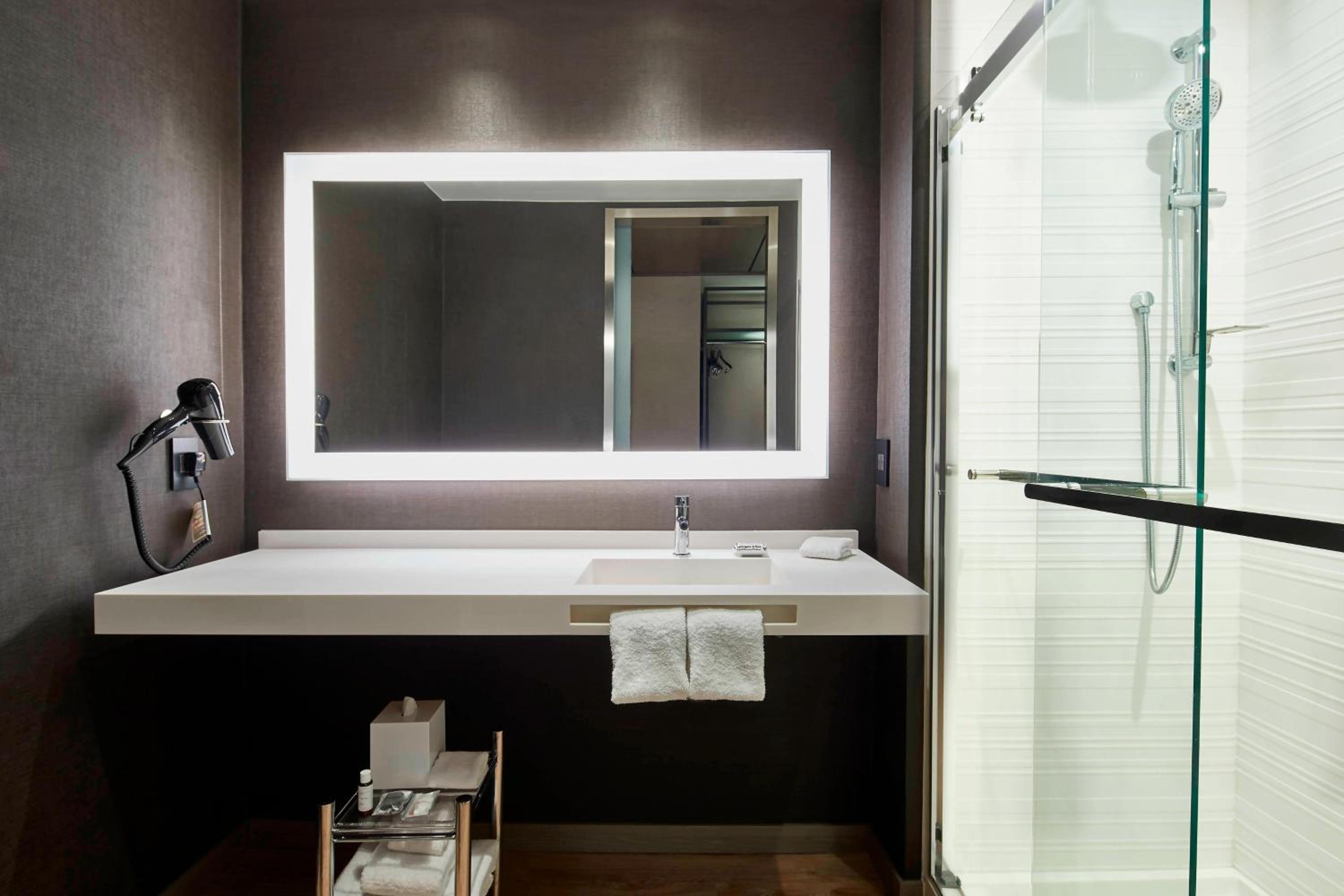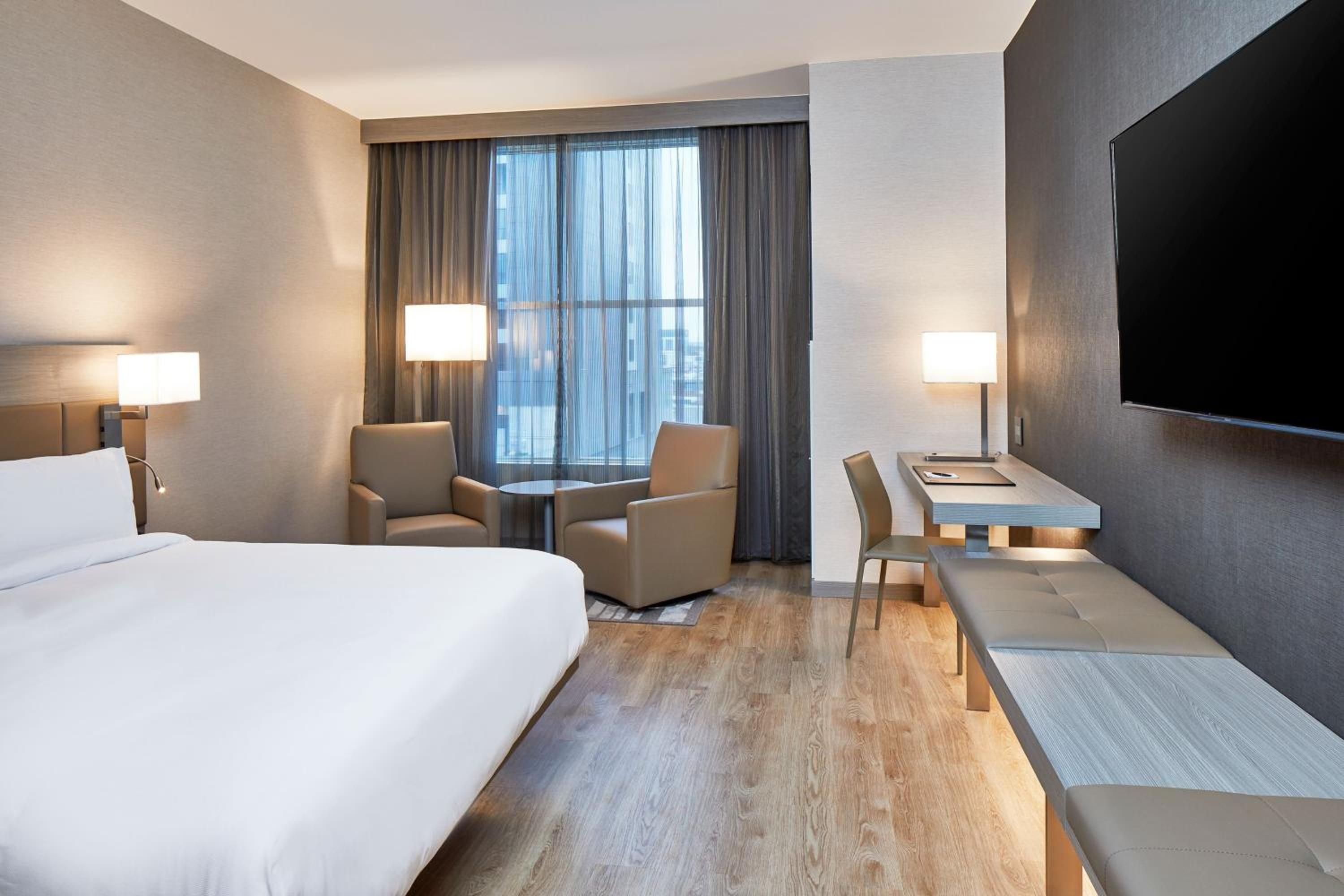 Each guest room at the hotel is designed for openness and comfort, featuring a seating area, flat-screen TV, open closet, and sleek desk for your convenience.