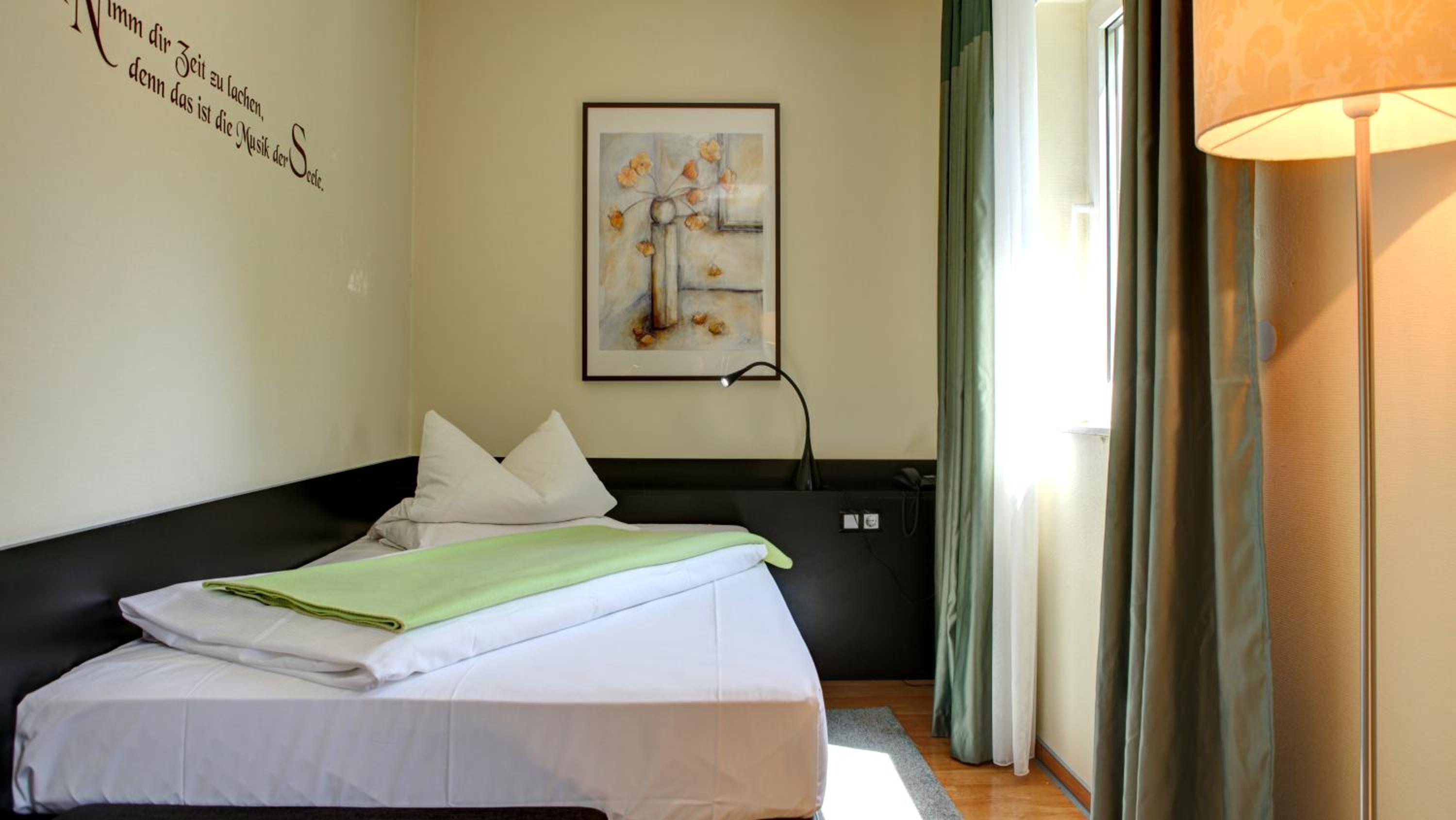 Das Bett Im Einzelzimmer ist schön breit, ca 1.2 m, aber das Zimmer ist Recht klein.