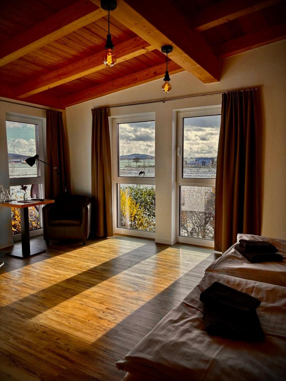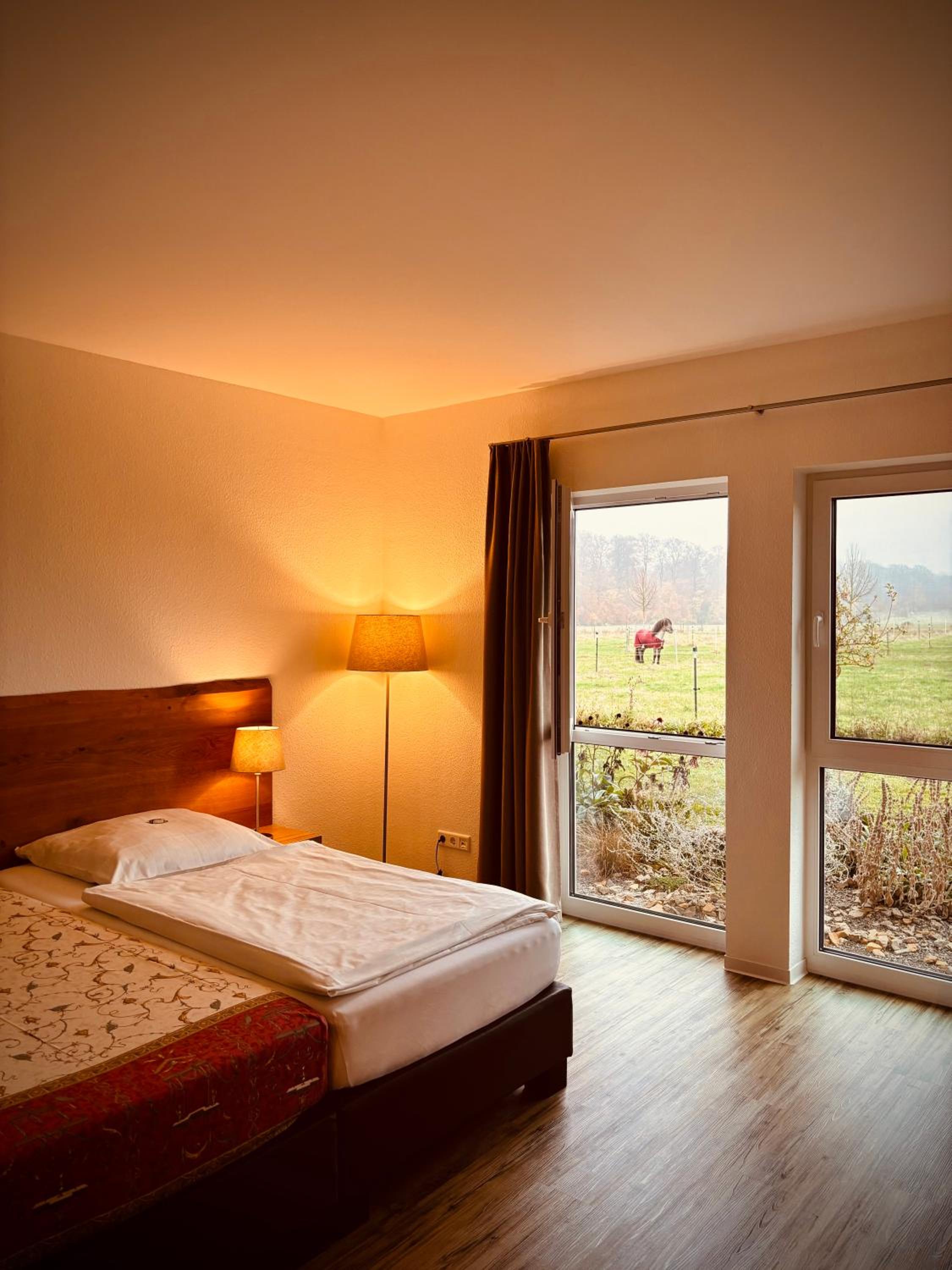Von Anfang an super gelaufen, wir kamen erst um 20 Uhr an, es war kein Problem dies zu organisieren. Die Gastgeberin war sehr nett und entgegen kommend. Das gesamte Ambiente ist einzigartig, sehr geschmackvoll und naturnah. Die Pferdeställe sind in unmittelbarer Nähe zum Hotel, und somit nah beim Liebling. Die Zimmer sind geräumig und sehr schön ausgestattet. Aus den großen Fenstern kann man in die unverbaute Landschaft, auf die Weiden schauen. Der Garten ist ganz toll, mit Steinen, Pflanzen und Ey Chatcher Elementen angelegt. Das Frühstück mit selbstgemachten Marmeladen, leckeren frischen Brötchen und farblich zum Ambiente passenden, selbst gelegten 🤣 Eiern, rundeten den sehr schönen Aufenthalt ab. Für unsere Lissi war bestens gesorgt, ein Bettchen, Napf und Fußtücher waren bereit gestellt.