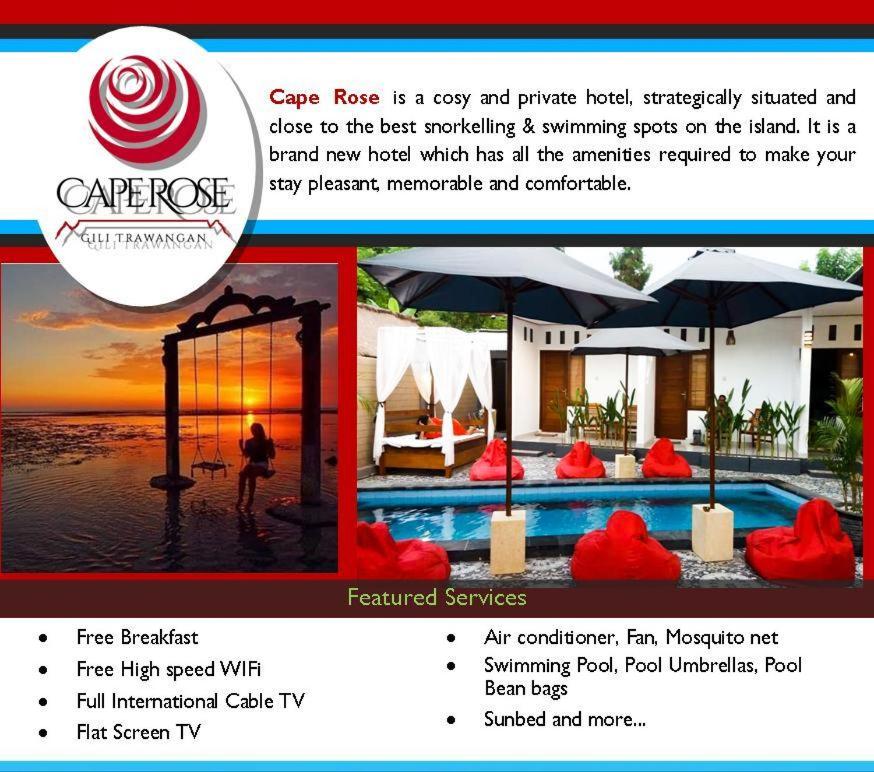 Indulge in comfort at Cape Rose with air-conditioned rooms and free WiFi just a short walk from Turtle Conservation Gili Trawangan. Enjoy pool views and relax by the outdoor pool during your stay.