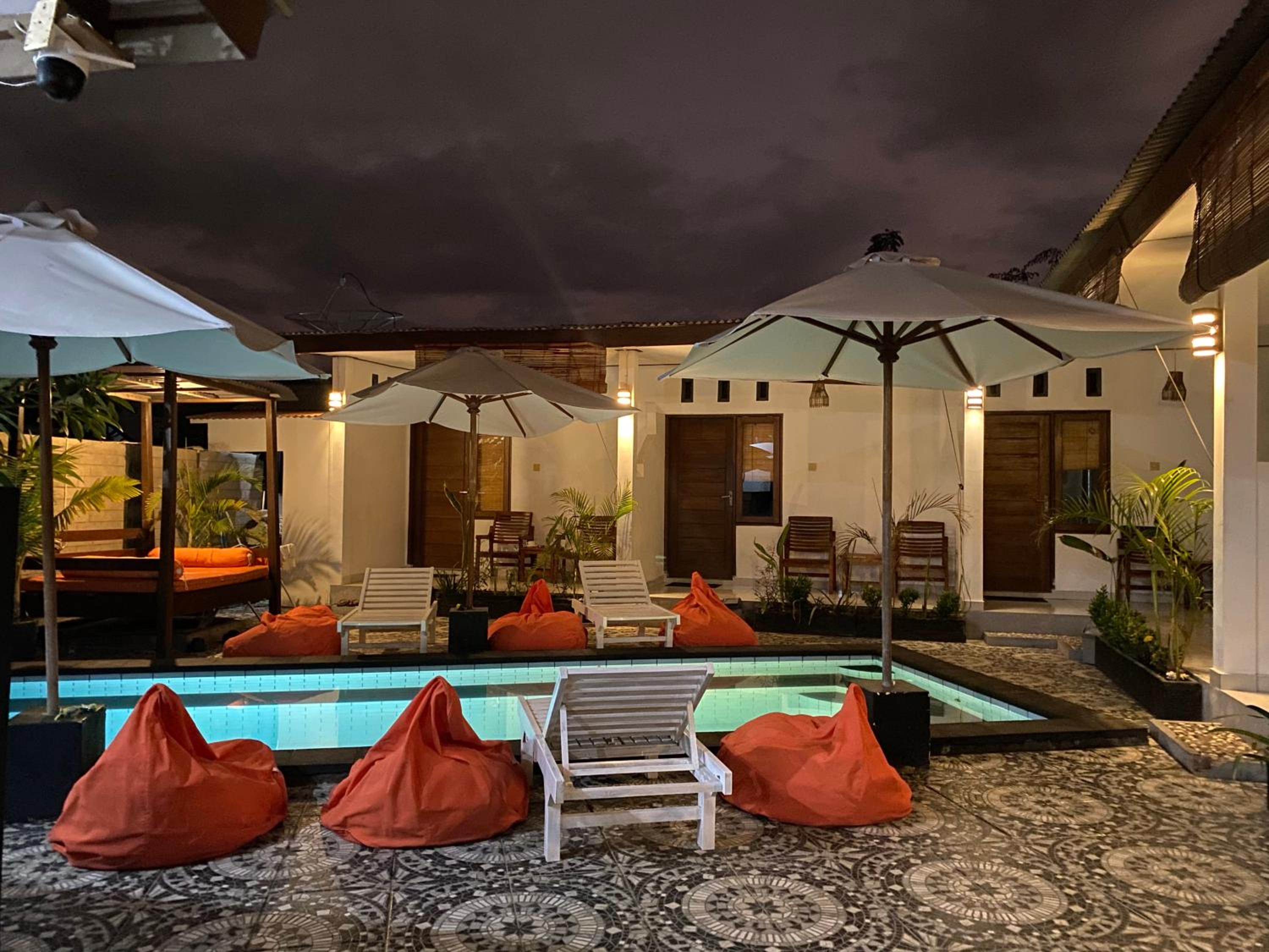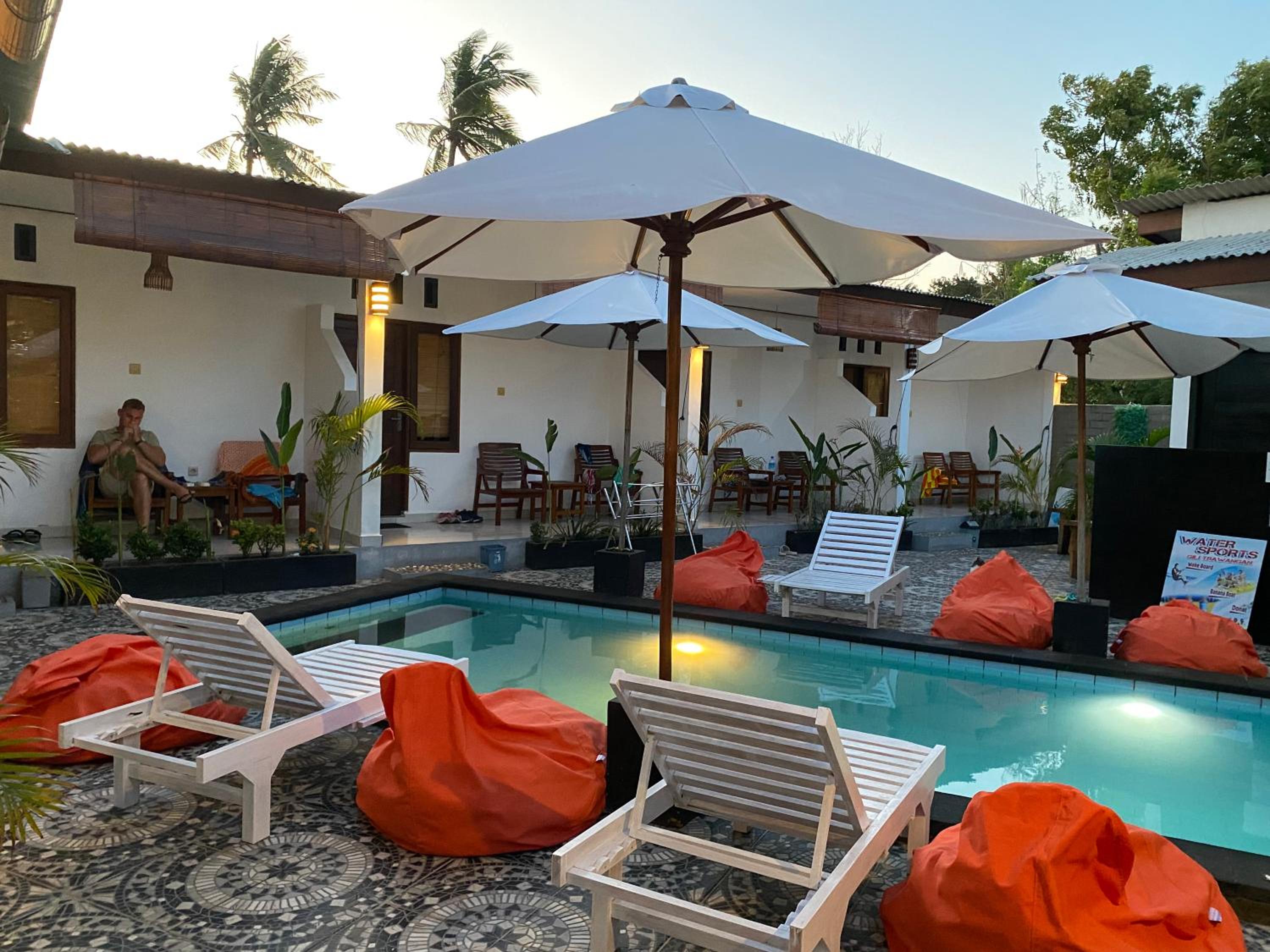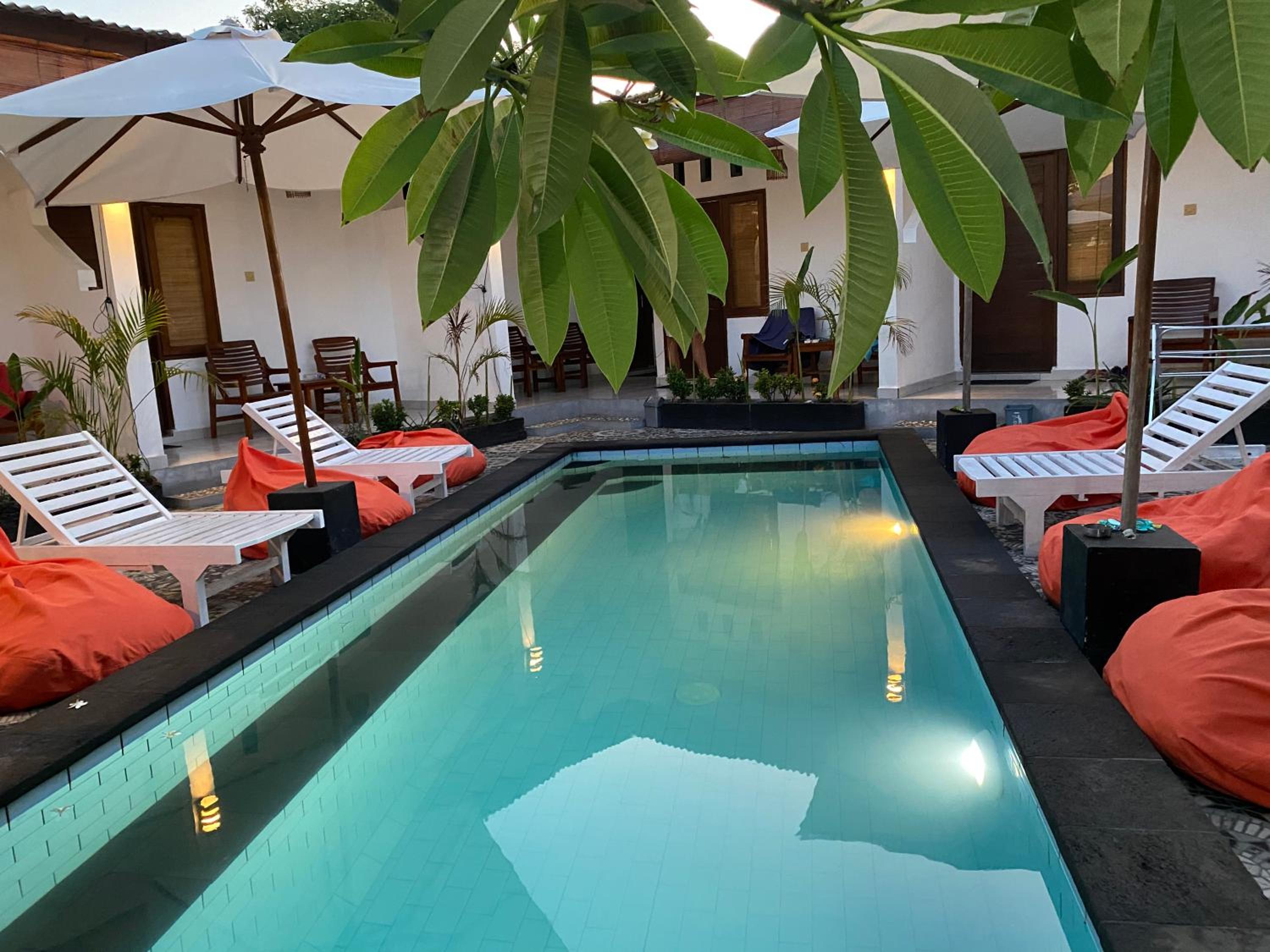 Very relax , rooms amazing mosquito nets, beds comfy lovely pool , only 8 villas which is lovely so not overcrowded. Near sunset beach and main strip