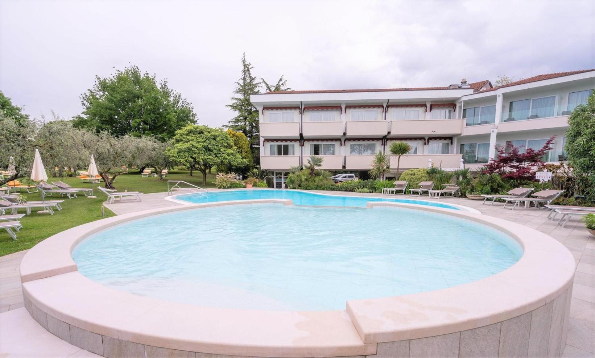 Hotel Giulietta Romeo offers a serene escape with its outdoor pool, lush garden, and relaxing sun loungers. Perfect for unwinding under the sun or taking a refreshing dip.