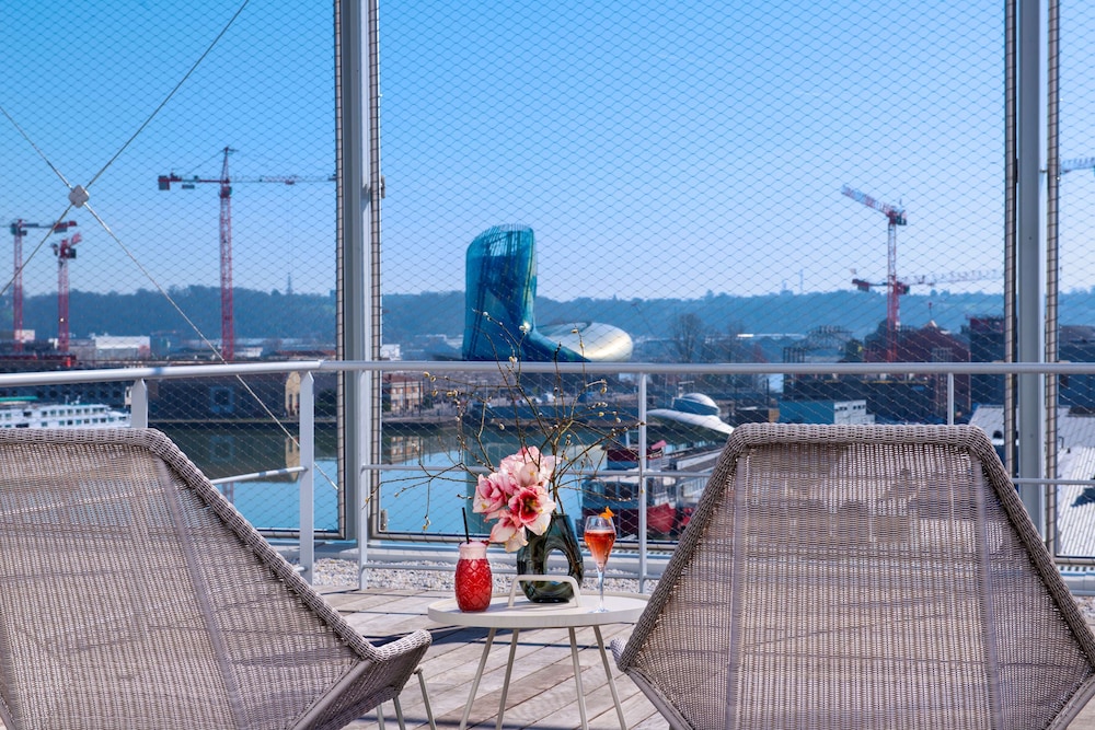 This hotel was great. A few bugs trying to figure out the parking garage but the staff was super helpful. The rooftop bar/restaurant was our favorite place every evening with wonderful views of the German submarine pens and the Cite de Vin. We drove the first 2 days to city center but walked along the water to Cite du Vin and found the tram station. So much easier to take the tram. Staff was so kind and helpful. Room was clean and comfortable. The breakfast is also on the deck and the food was much better than I expected and the customizable coffee machines made my mornings. Highly recommend and would stay here again if we return to the area.