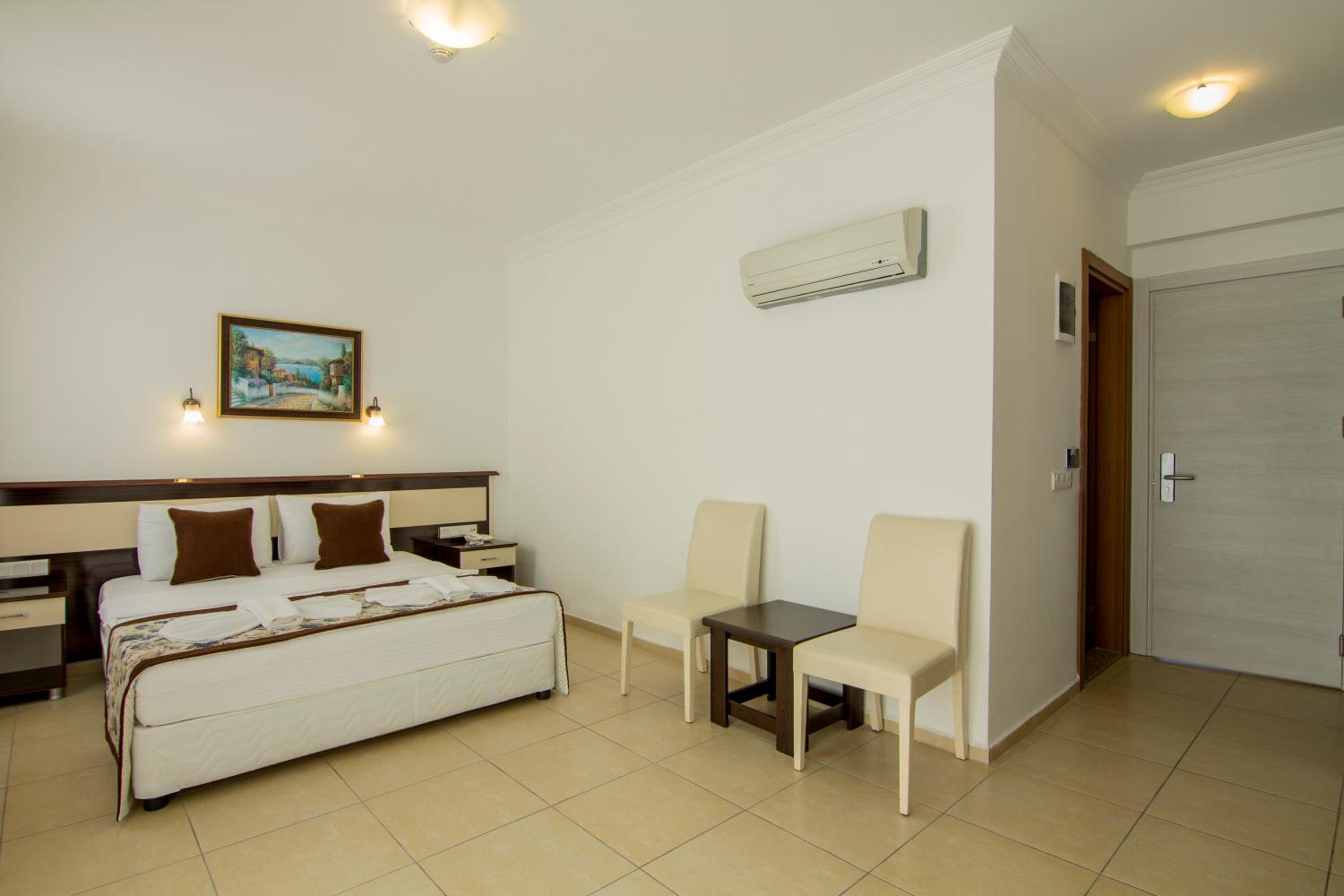 Belcekum Beach Hotel offers stylish rooms equipped with modern amenities, including air conditioning, flat-screen TVs, and some with private balconies. The cozy rooms provide a comfortable retreat for guests after a day of exploring the beautiful surroundings.