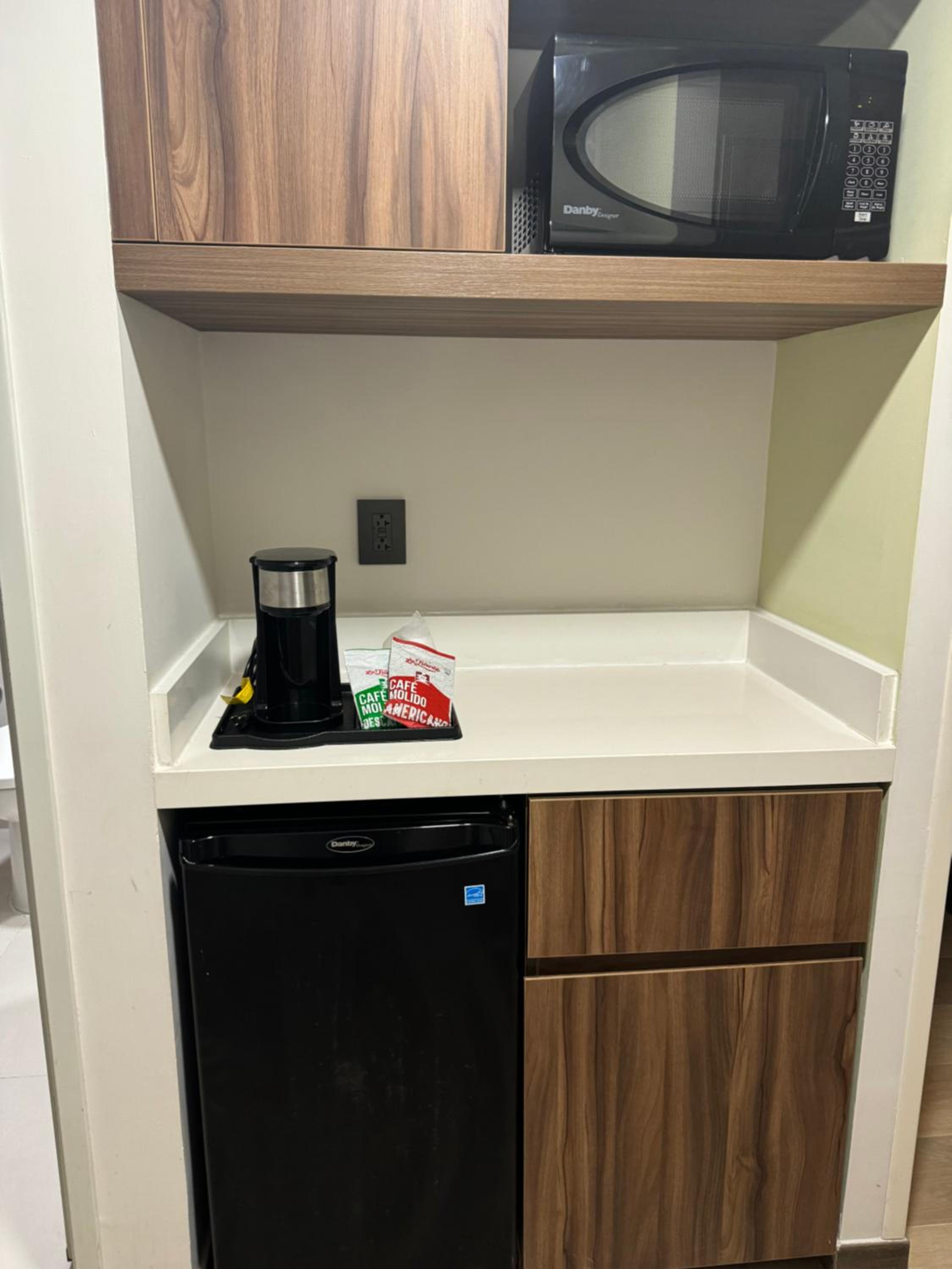 La habitación muy amplia y cómoda, con un refrigerador pequeño, microondas y servicio de café. Las camas con 4 almohadas.