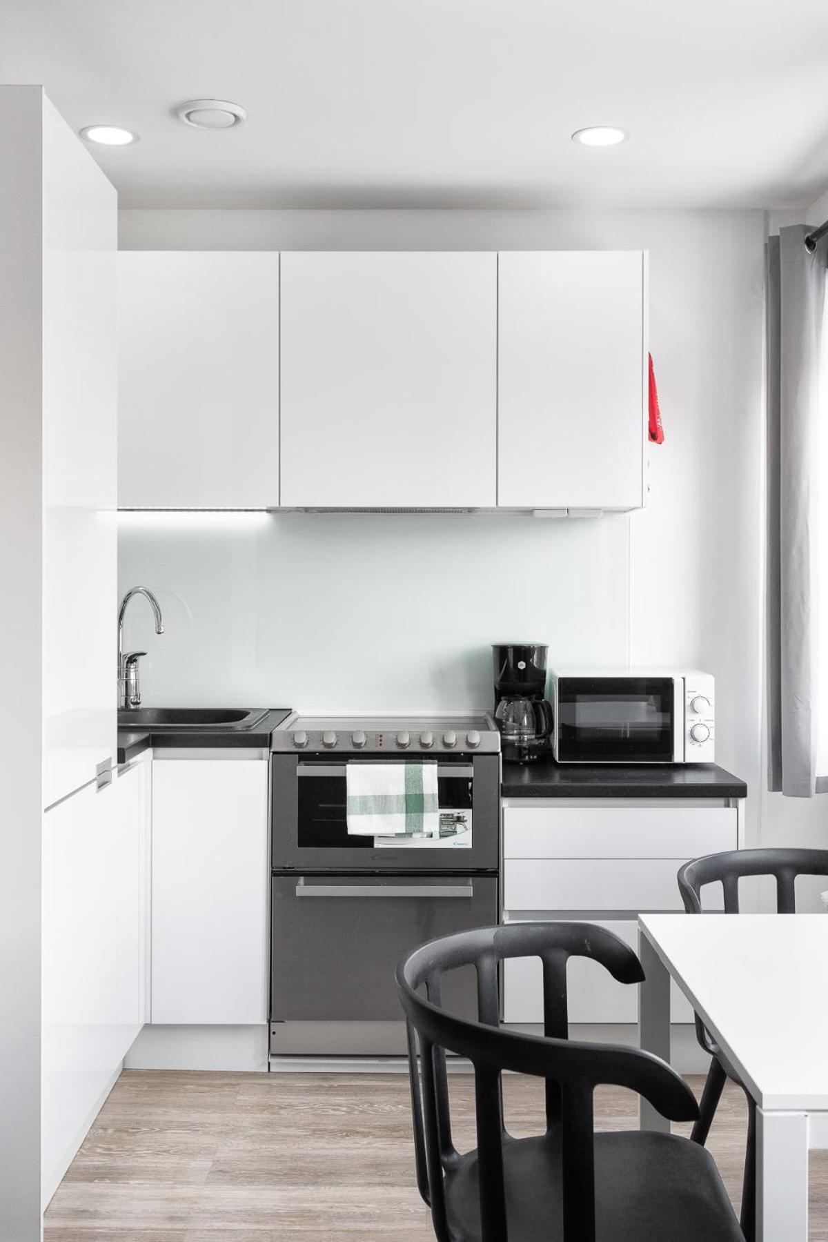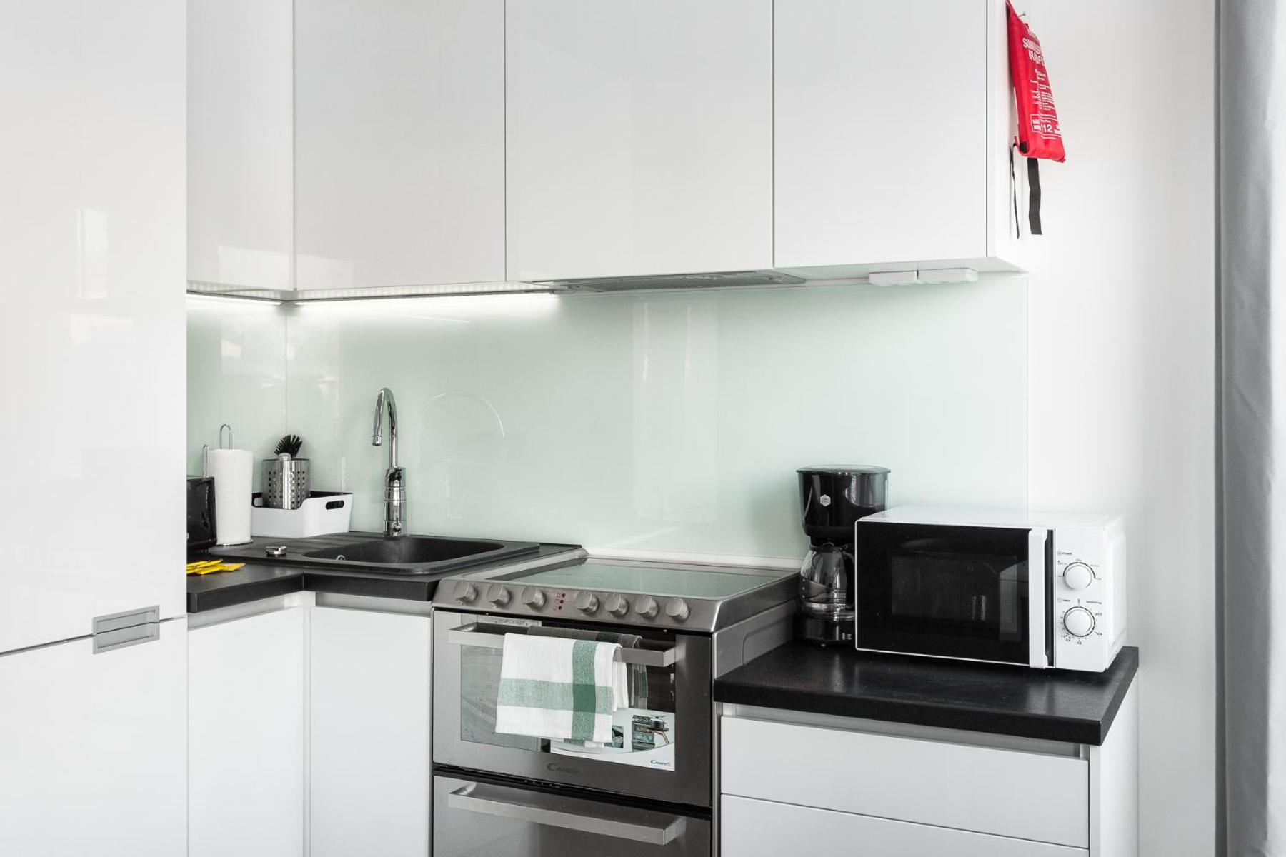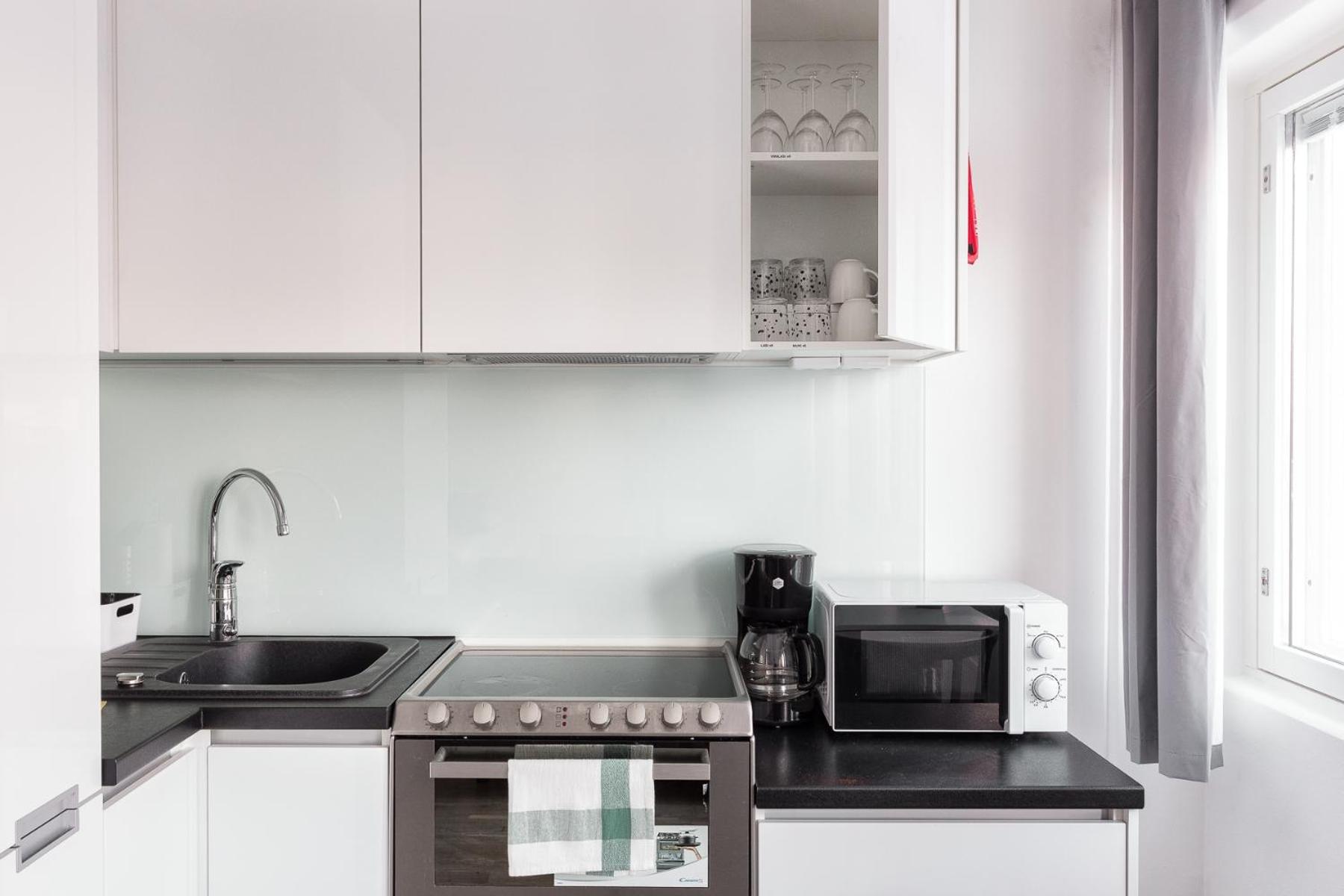 Clean flat in excellent location - 300meters to station and 12 minutes to Central Station. Very warm in winter. Garage for car provided in price, so no need to scrub the car in the morning. The part with beds was deeper in the room, so light from the kitchen part did not disturb the sleeper. Microwave in the kitchen. Smooth check in.