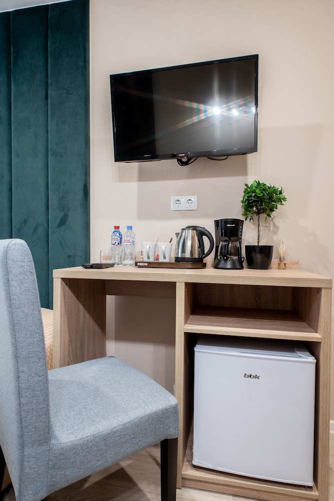 Номер был тесноват, но это компенсировалось наличием "дополнительных опций". Например, личный чайник, кофеварка, хороший телевизор, халаты и т.д.
