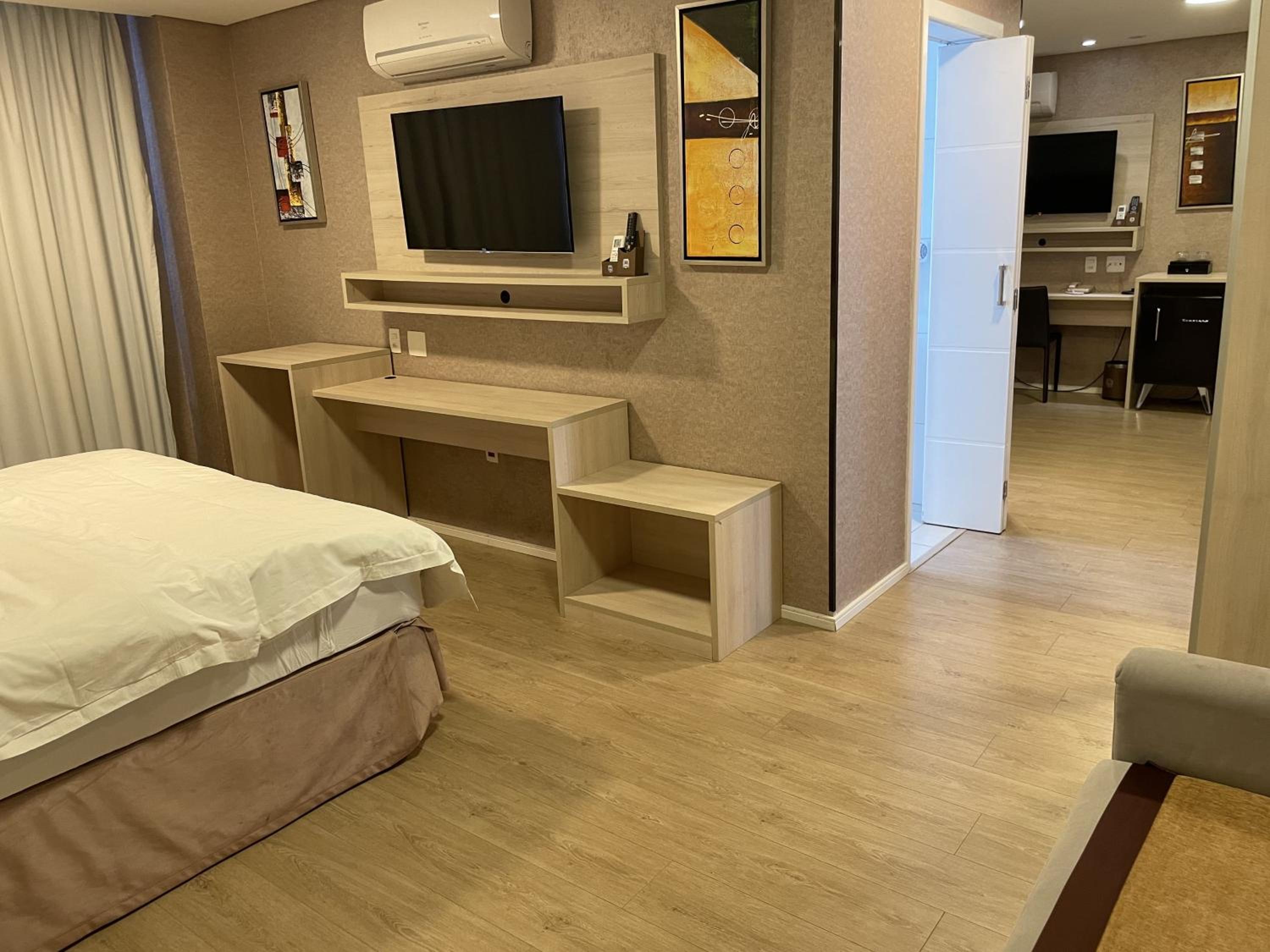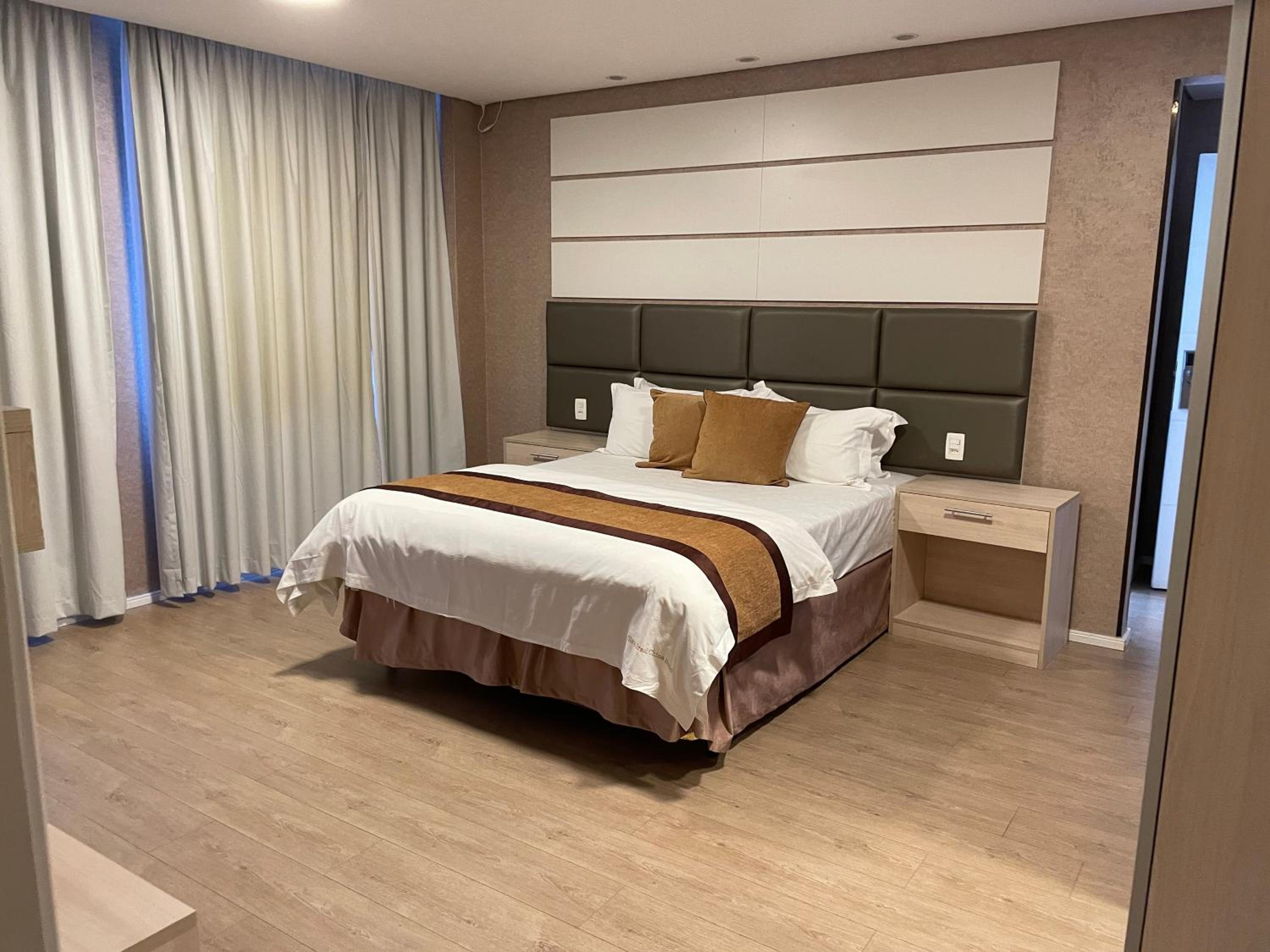 Cama e quarto amplos, organizados e limpos