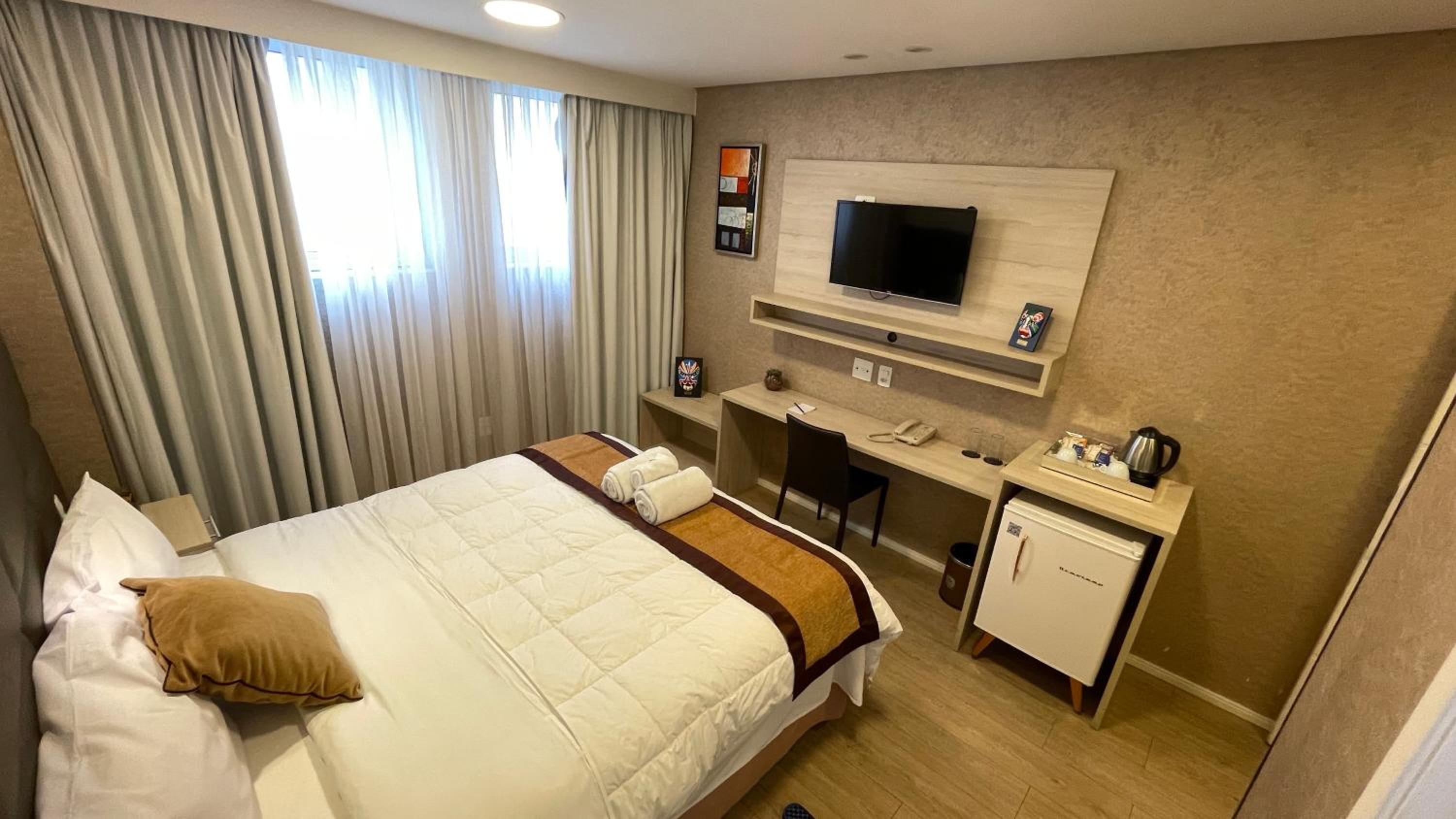 Frigobar precisa buscar na recepção. Chuveiro não mantinha a água na mesma temperatura e pressão, ficava oscilando a quantidade e água e a temperatura, como se uma criança estivesse brincando de abrir e fechar o registro.