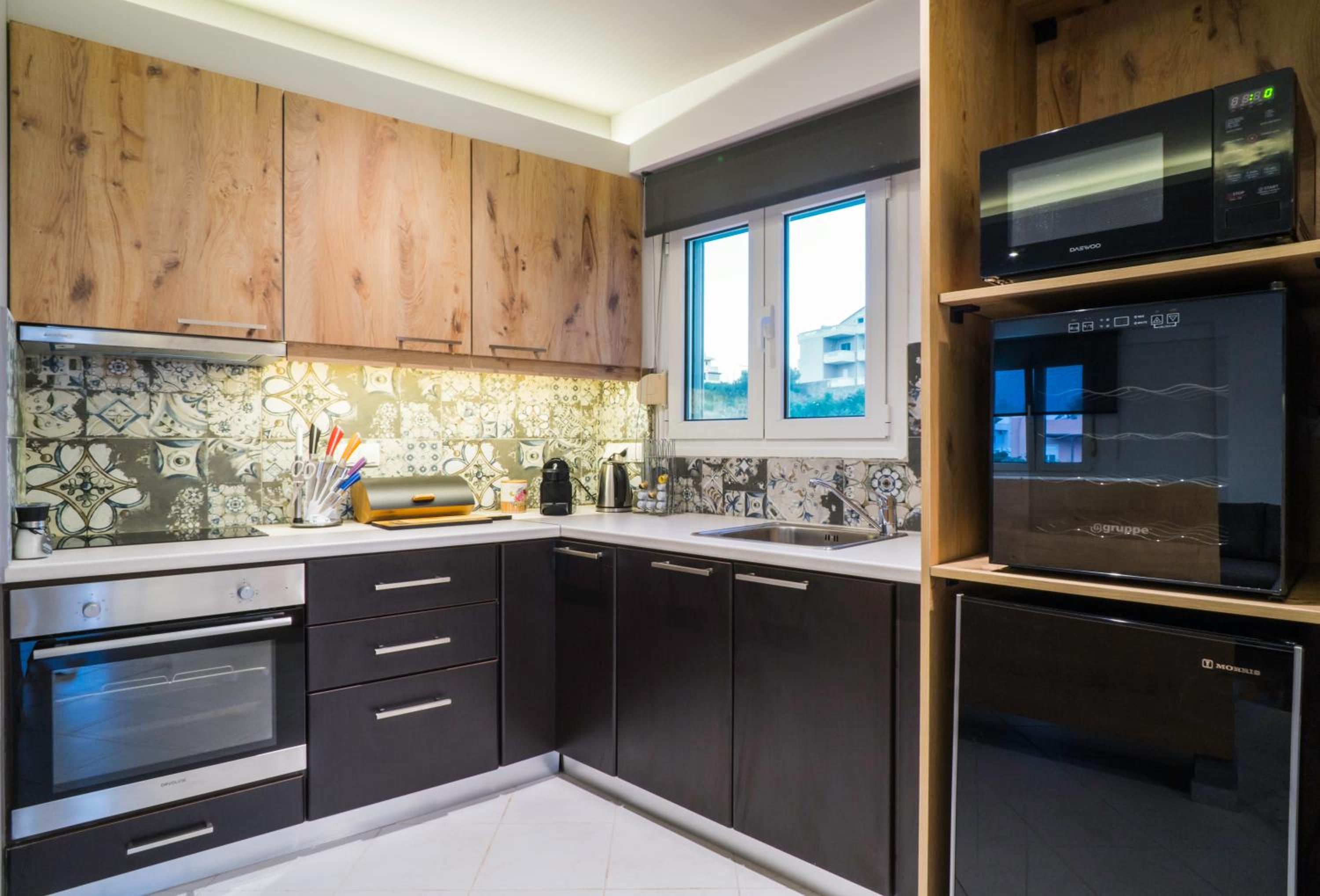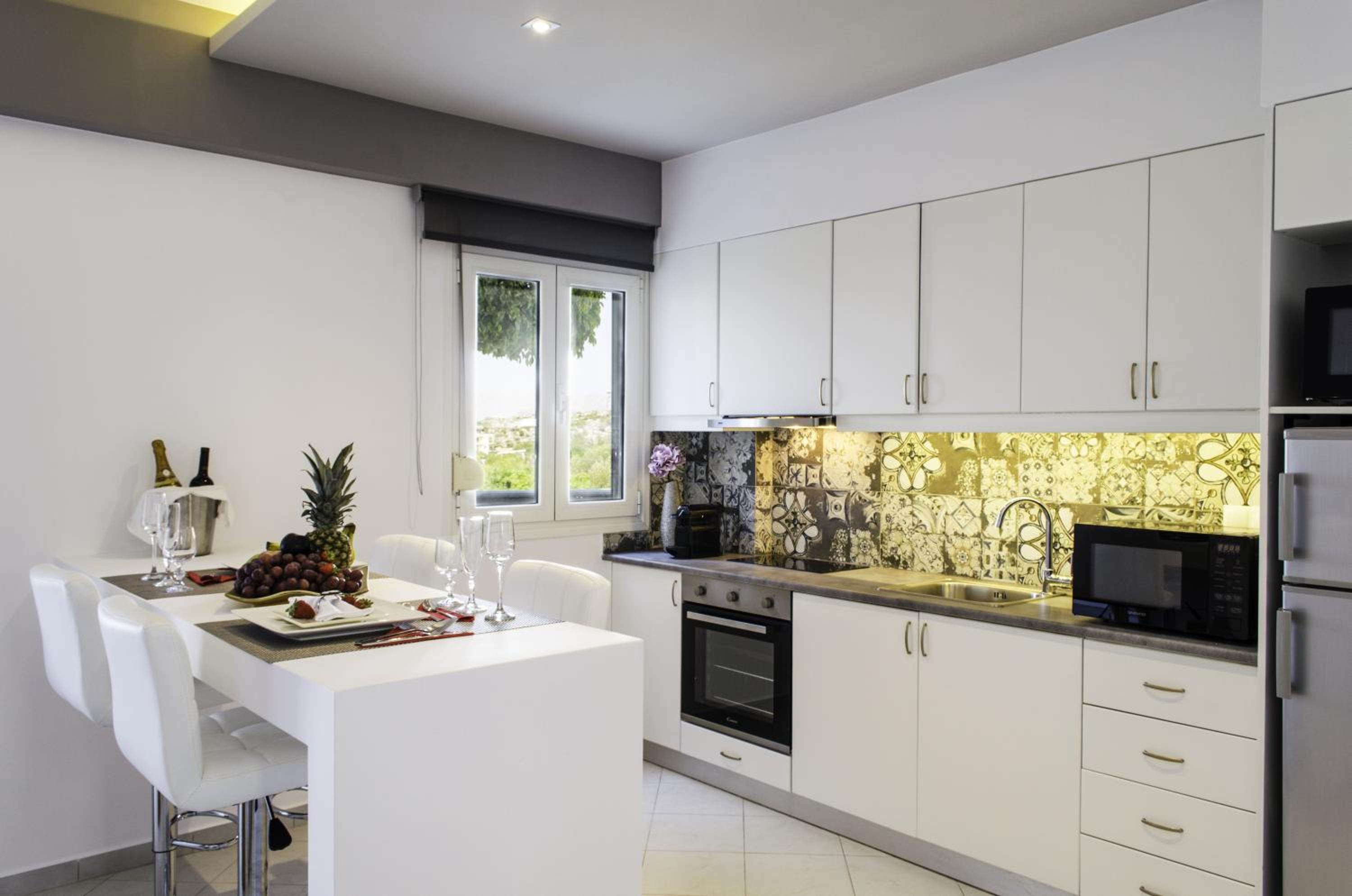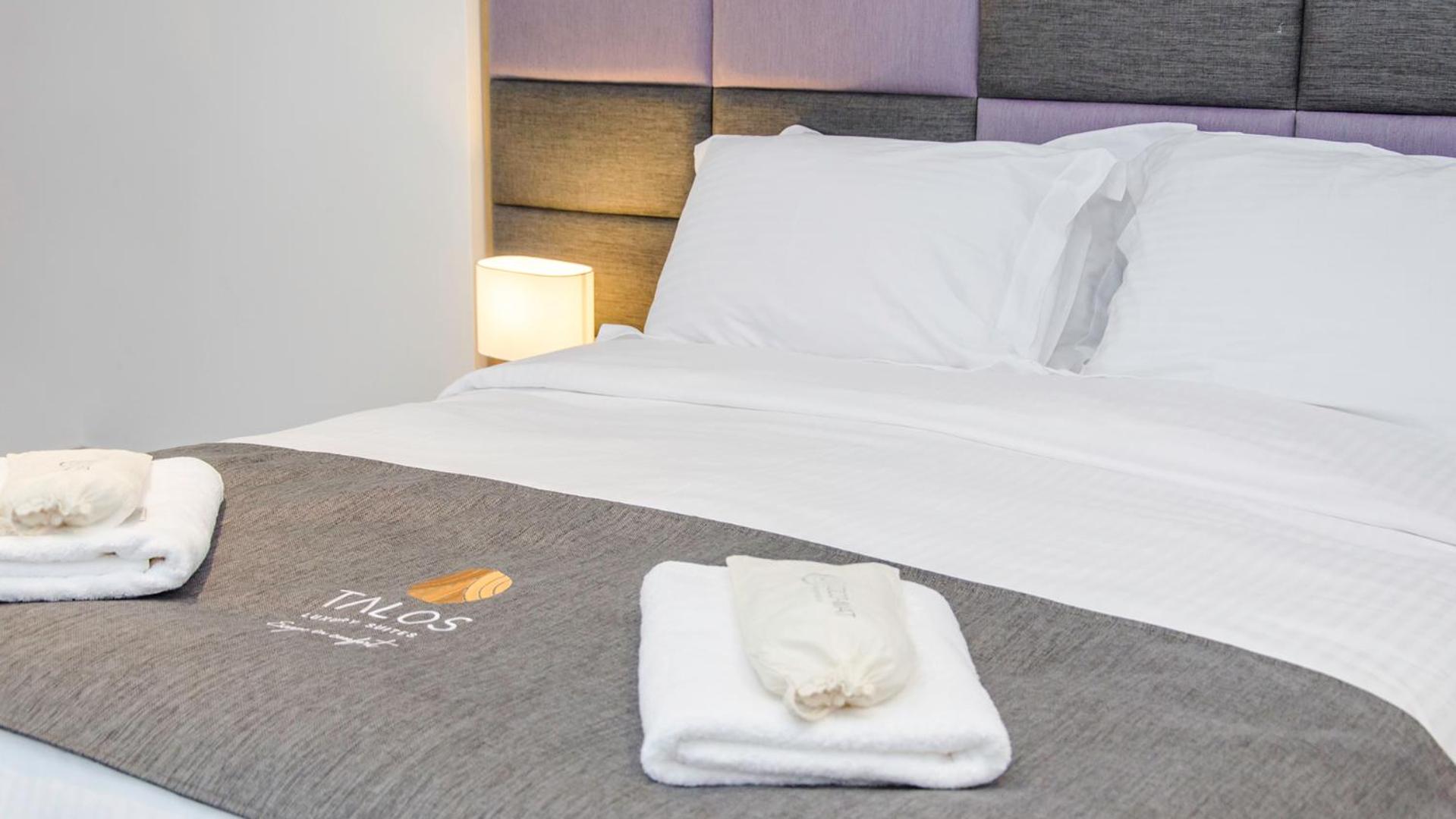 Talos Luxury Suites offers well-equipped units with modern amenities, including a kitchen, flat-screen TV, and private bathroom with upscale features like bathrobes and slippers.