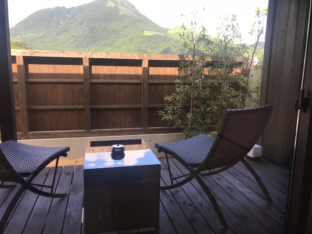 Take in picturesque views from the terrace and garden at Yufuin Rikka.