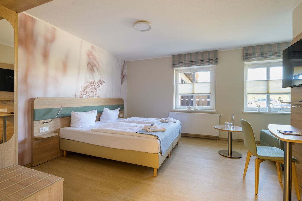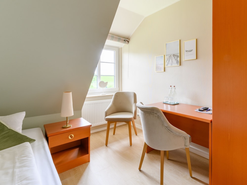 Gefallen hat uns die ruhige Lage gleich hinter dem Deich. Idealer Ausgangspunkt für Radausflüge in der Umgebung. Das nette Ambiente und das freundliche und hilfreiche Personal ist besonders zu erwähnen. Ein großes Lob auch für die Küche ! Die Fischgerichte sind sehr gut und von überraschender Schmackhaftigkeit ! Sehr zu empfehlen. Wir haben uns in der viel zu kurzen Zeit sehr wohl gefühlt und uns gut erholt.