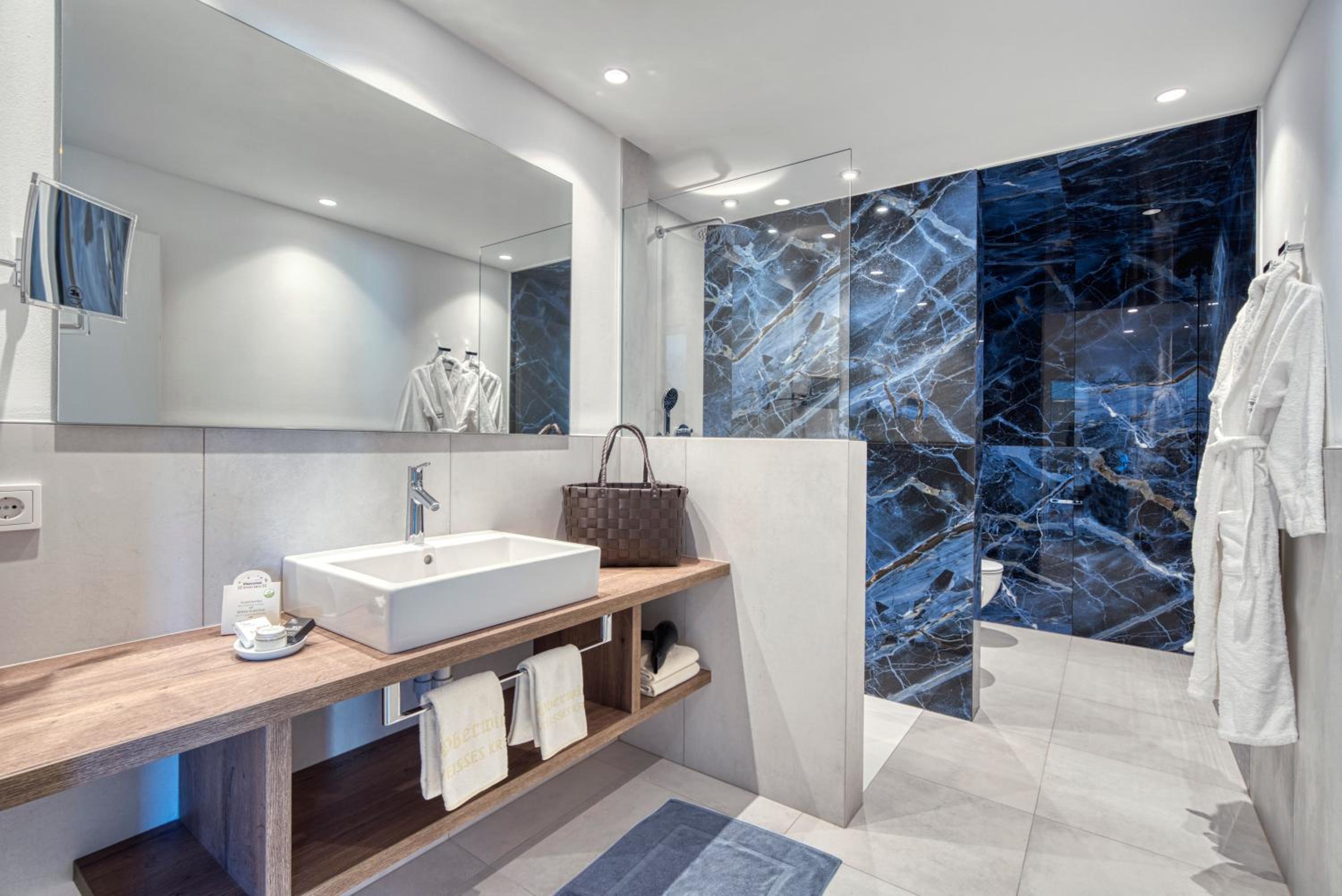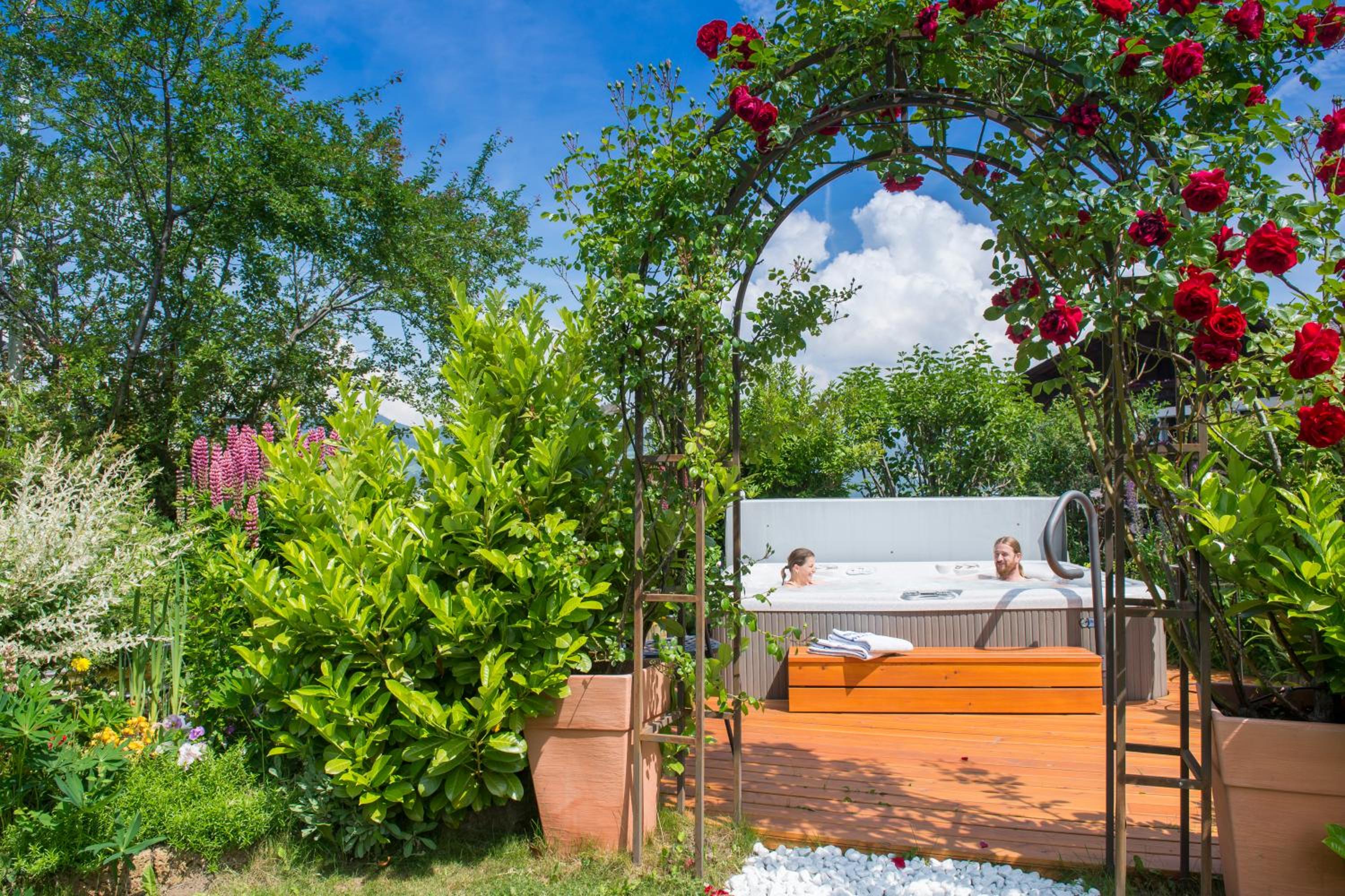 Unwind in spacious alpine-style rooms with mountain or garden views, modern amenities, and plush bathrobes for the ultimate comfort.