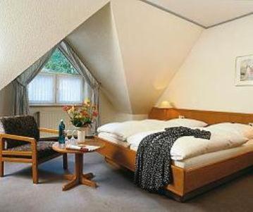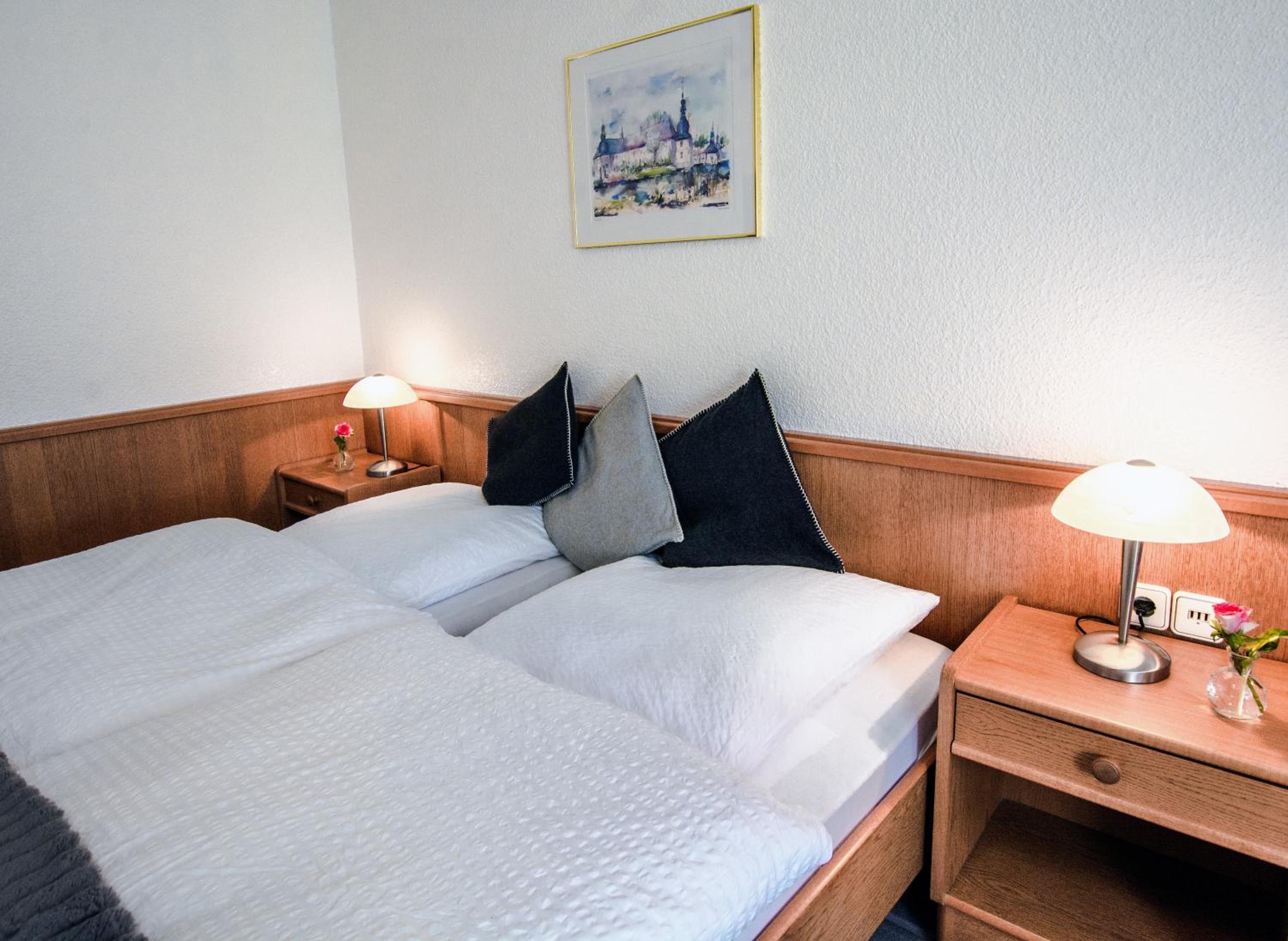 Einrichtung schon älter, aber recht bequeme Betten. TV musste erst neu eingestellt werden. Ein Teil des Frühstücks-Angebots wurde erst nach-und-nach (als wir fast fertig waren) „aufgetischt“. Parken nur vor der Tür mit Parkscheibe und begrenzter Parkzeit.