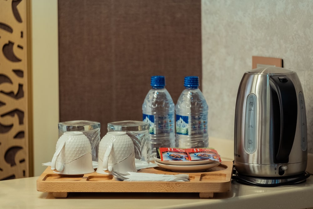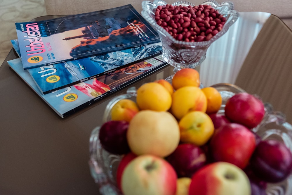 Clean and neat hotel, unlimited complementary bottled water, Uzbek hospitality offering national pastries to your room